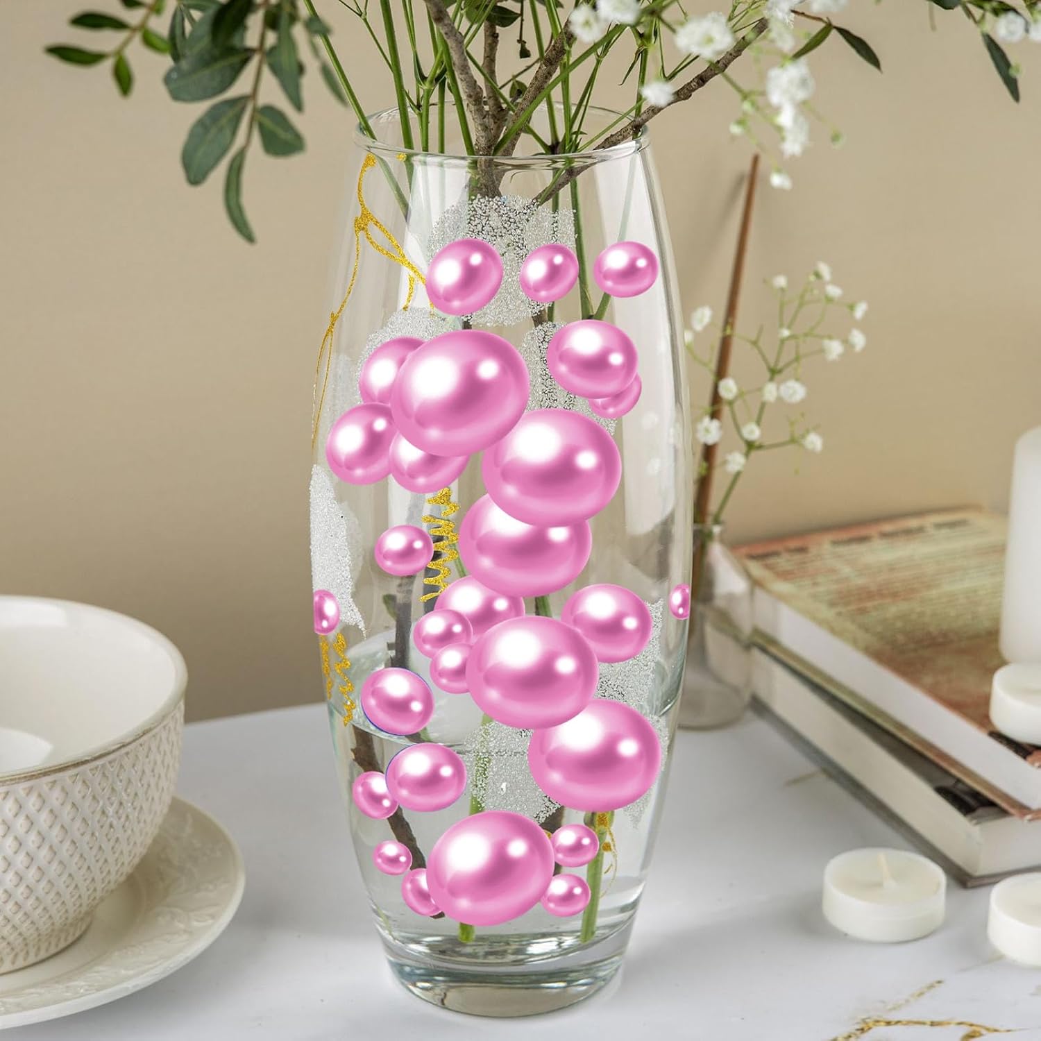 - 【Beads for Decoration】fake pearls are ideal as vase fillers, the pearl decor surprises your family, and friends, Vase Beads for centerpieces are a great romantic and simply elegant, decorate your floral arrangements, use Vase Beads for vases no hole as vase fillers, candle plate decorations, give you a sense of beauty and magnificence. decorative pearls perfect for wedding and family graduation bridal shower decorations; birthday, holiday, DIY Crafts.
