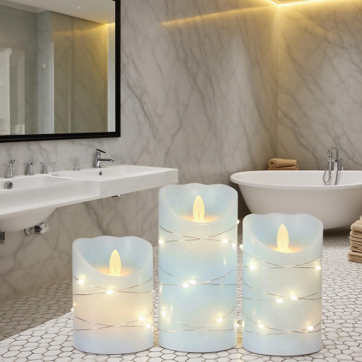 - Flameless Candles + Shining Stars - The difference from traditional candles is the addition of starlight. Each candle is decorated with 9-14 small lamp beads, and each candle is surrounded by bright and delicate light. Wrapped in a silver light string, this is a unique aesthetic effect that combines the appearance of fairy lights with classical beauty.