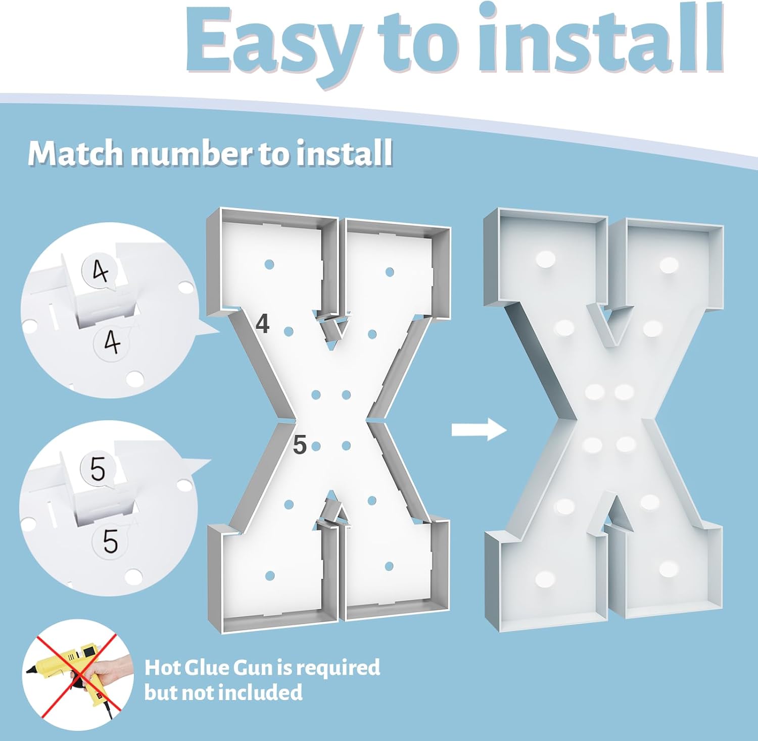 - ASSEMBLY REQUIRED: Marquee Light Up Letters consists of pre-cut frames with slots, the numerical markings in the mounting sequence will easily guide you through the matching, which requires a hot glue gun to bond and screw in the bulbs. Finish 4 feet tall checkbox letters (Note: Glue gun and batteries are not included)
