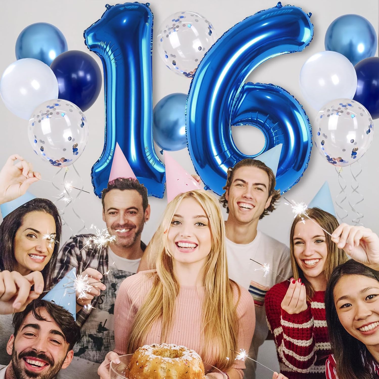 - π Dark Blue Number 16 Balloon: Our package included 40 inch foil number 16 balloon(2pcs), 12 inch metallic blue balloon(4pcs), blue silver confetti balloon(4pcs), pastel blue balloon(4pcs), Light Navy Blue Balloon(2pcs), 1pcs straw and 1 roll ribbon. Simply inflate the balloon using the straw, and you're ready to party! Navy blue number foil balloons are the best for girls or boys birthday party decoration.