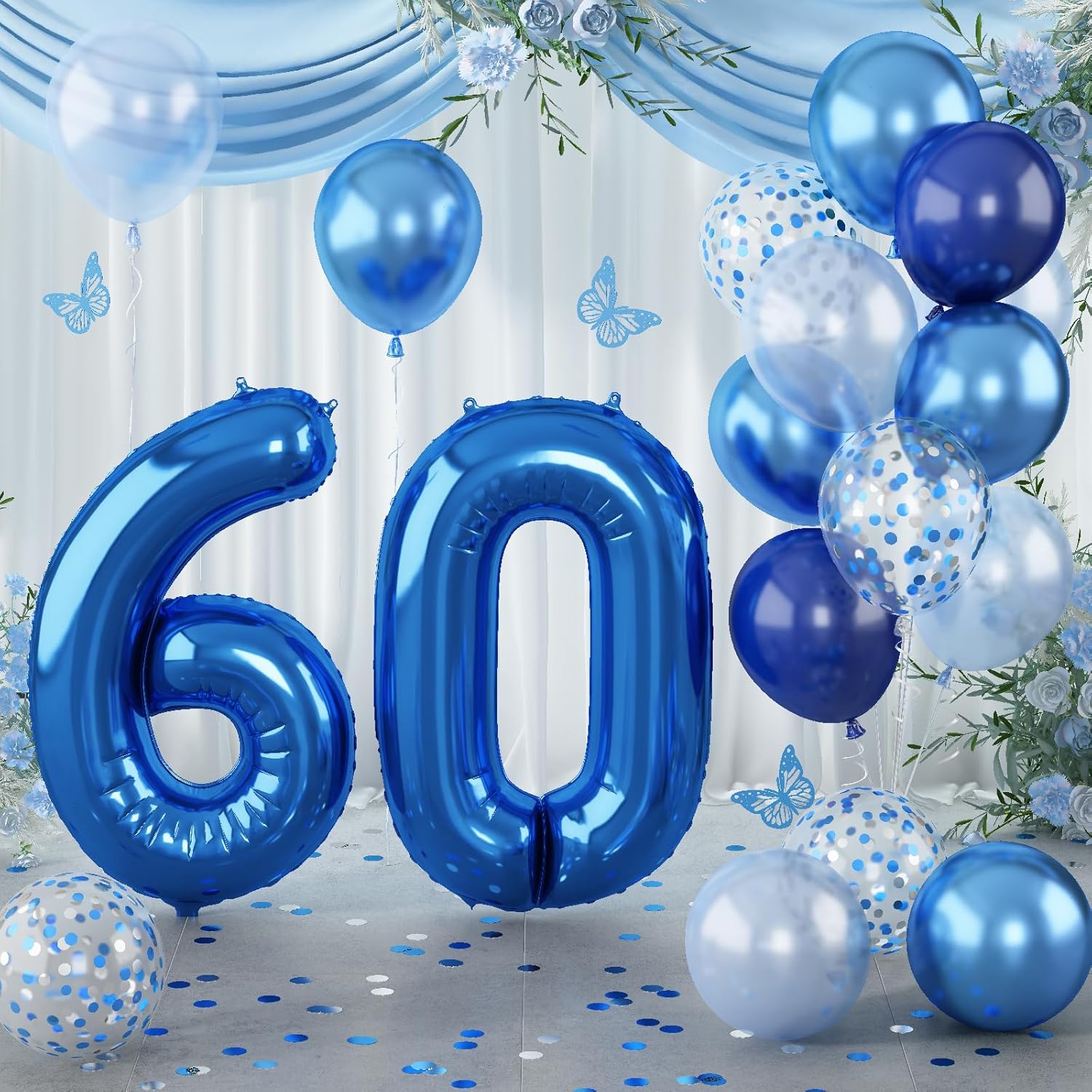 - π Dark Blue Number 60 Balloon: Our package included 40 inch foil number 60 balloon(2pcs), 12 inch metallic blue balloon(4pcs), blue silver confetti balloon(4pcs), pastel blue balloon(4pcs), Light Navy Blue Balloon(2pcs), 1pcs straw and 1 roll ribbon. Simply inflate the balloon using the straw, and you're ready to party! Navy blue number foil balloons are the best for men or women birthday party decoration.