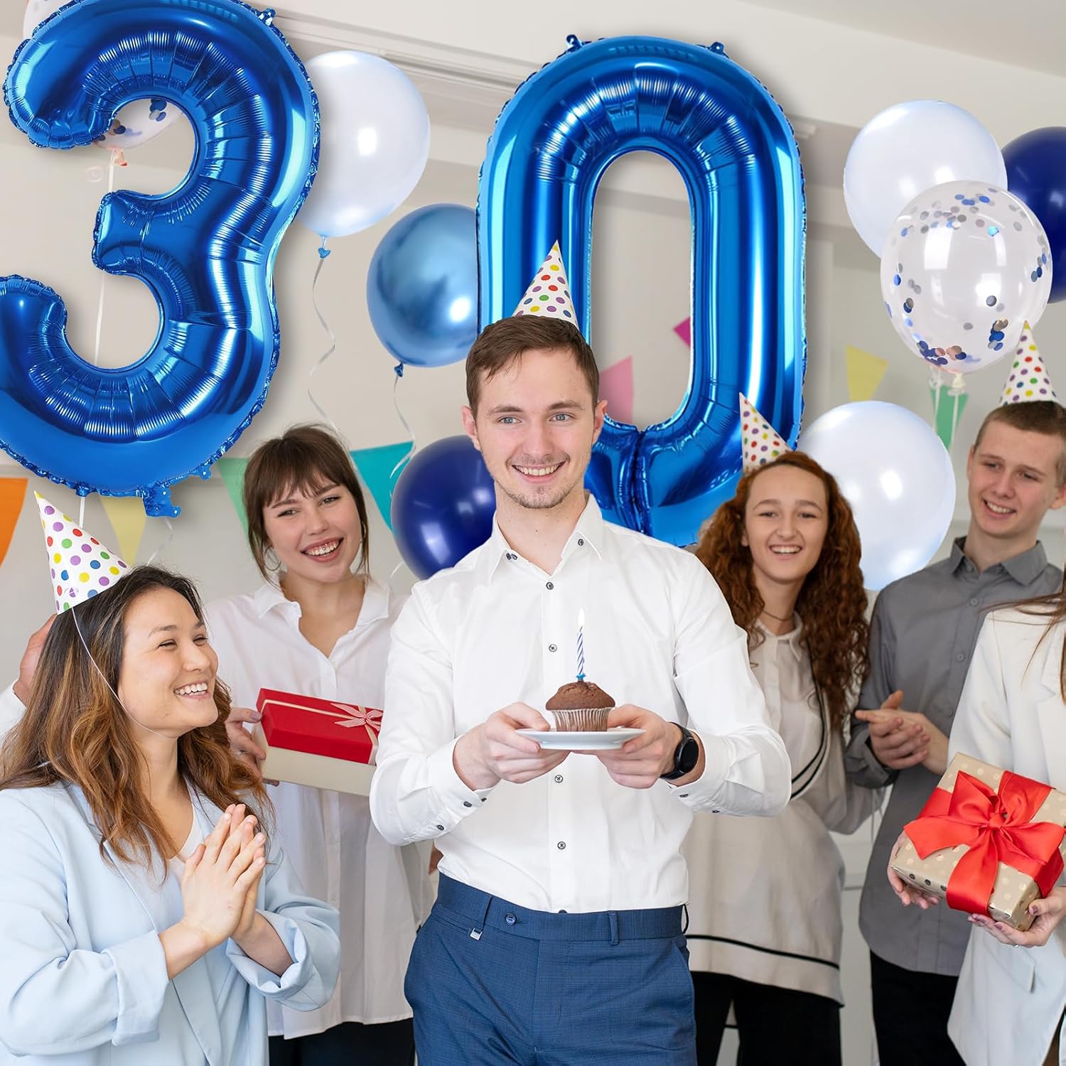 - π Dark Blue Number 30 Balloon: Our package included 40 inch foil number 30 balloon(2pcs), 12 inch metallic blue balloon(4pcs), blue silver confetti balloon(4pcs), pastel blue balloon(4pcs), Light Navy Blue Balloon(2pcs), 1pcs straw and 1 roll ribbon. Simply inflate the balloon using the straw, and you're ready to party! Navy blue number foil balloons are the best for men or women birthday party decoration.
