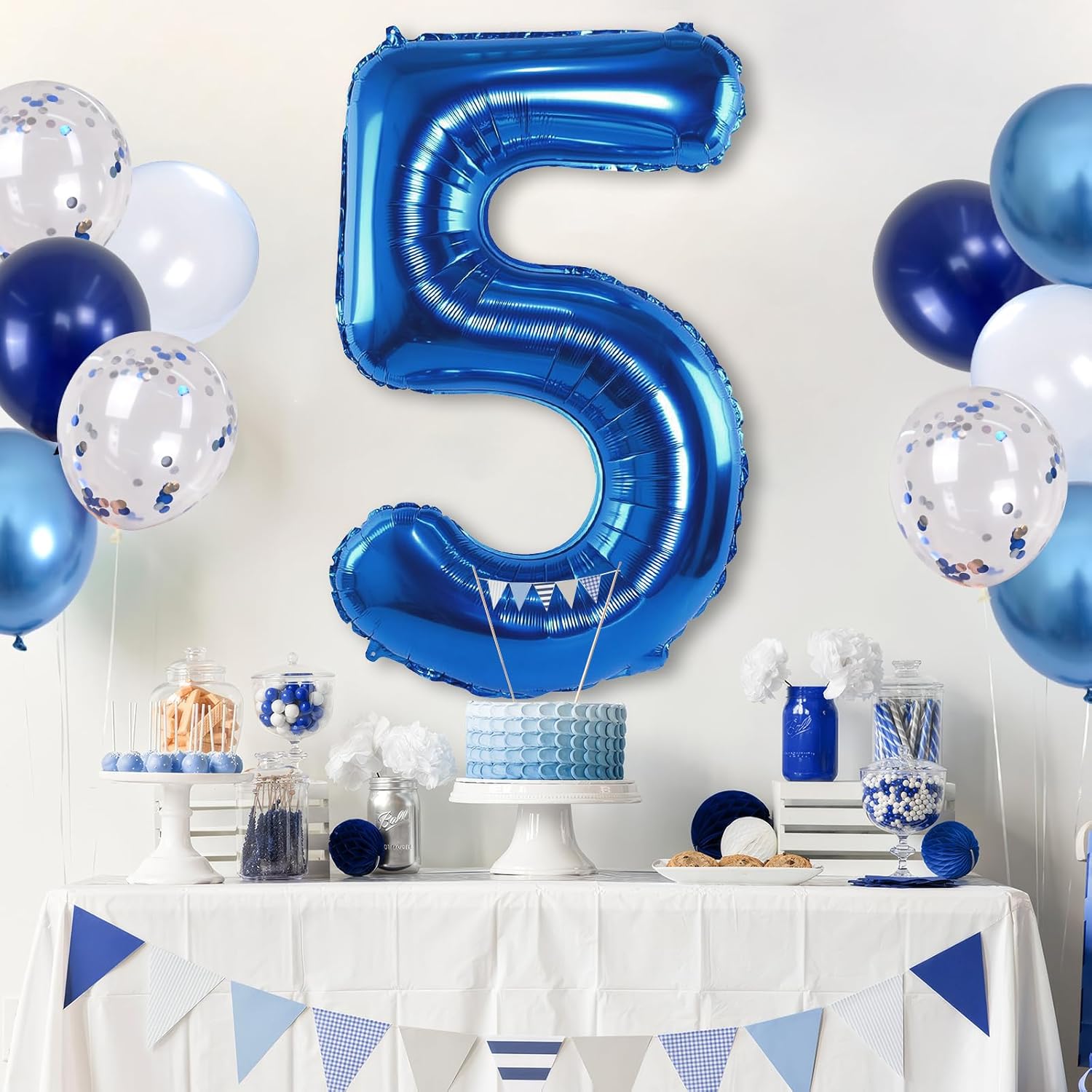 - π Dark Blue Number 5 Balloon: Our package included 40 inch foil number 5 balloon(1pcs), 12 inch metallic blue balloon(4pcs), blue silver confetti balloon(4pcs), pastel blue balloon(4pcs), Light Navy Blue Balloon(2pcs), 1pcs straw and 1 roll ribbon. Simply inflate the balloon using the straw, and you're ready to party! Navy blue number foil balloons are the best for girls or boys birthday party decoration.