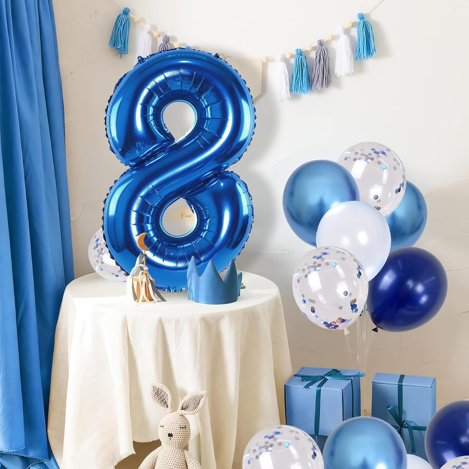 - ๐ Dark Blue Number 8 Balloon: Our package included 40 inch foil number 8 balloon(1pcs), 12 inch metallic blue balloon(4pcs), blue silver confetti balloon(4pcs), pastel blue balloon(4pcs), Light Navy Blue Balloon(2pcs), 1pcs straw and 1 roll ribbon. Simply inflate the balloon using the straw, and you're ready to party! Navy blue number foil balloons are the best for girls or boys birthday party decoration.