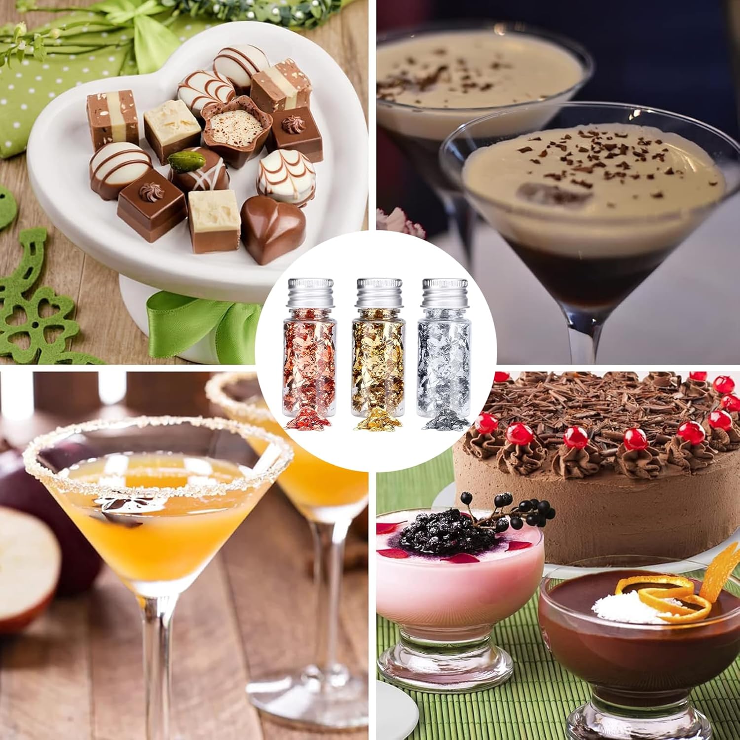 - 【Perfect Decoration For Food】Edible gold flakes is a perfect decorative items, can be added to coffee, tea, hot pot, seasonings, cosmetics, bath agents, etc. Gold leaf fakes beautiful and stylish, gold flakes for crafts can be widely used in families, bars, restaurants, etc.