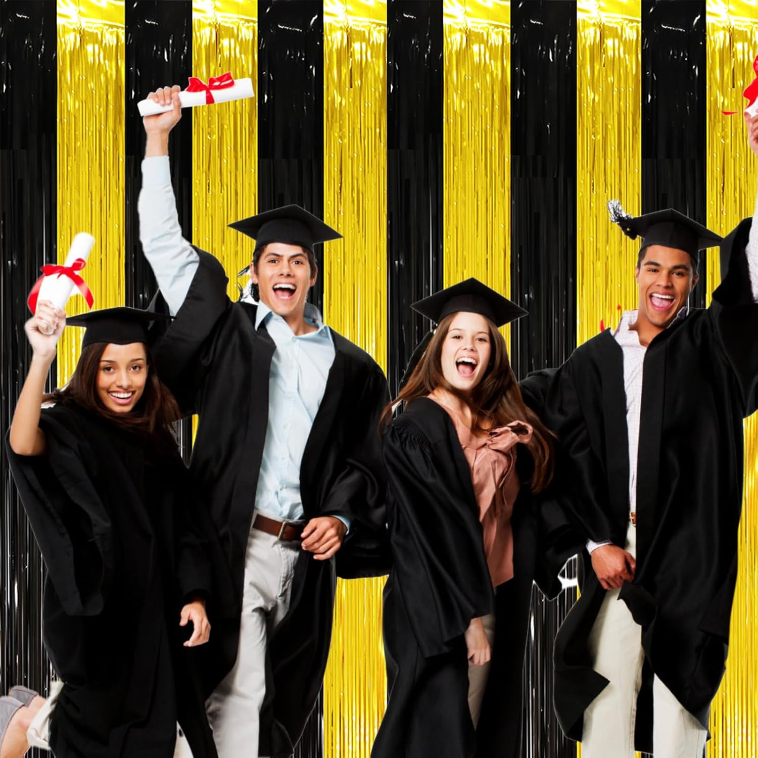 - Stunning Decorative Set: You'll receive 2 pcs black and gold foil fringe backdrop curtains, each measuring 3.28 ft (wide)ร6.56 ft (drop). Enough length foil fringe curtains backdrops are perfect for the door or wall to create an impressive decoration