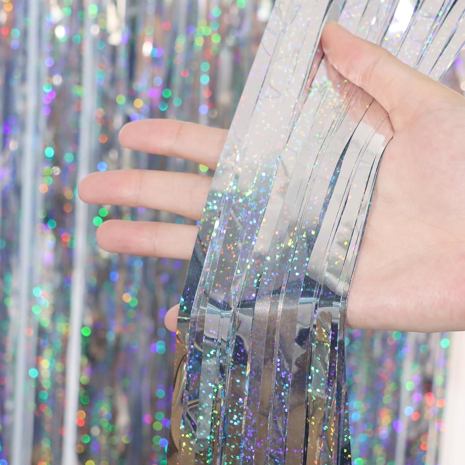 - Stunning Decorative Set: You'll receive 2 pcs laser silver foil fringe backdrop curtains, each measuring 3.28 ft (wide)ร6.56 ft (drop). Enough length foil fringe curtains backdrops are perfect for the door or wall to create an impressive decoration