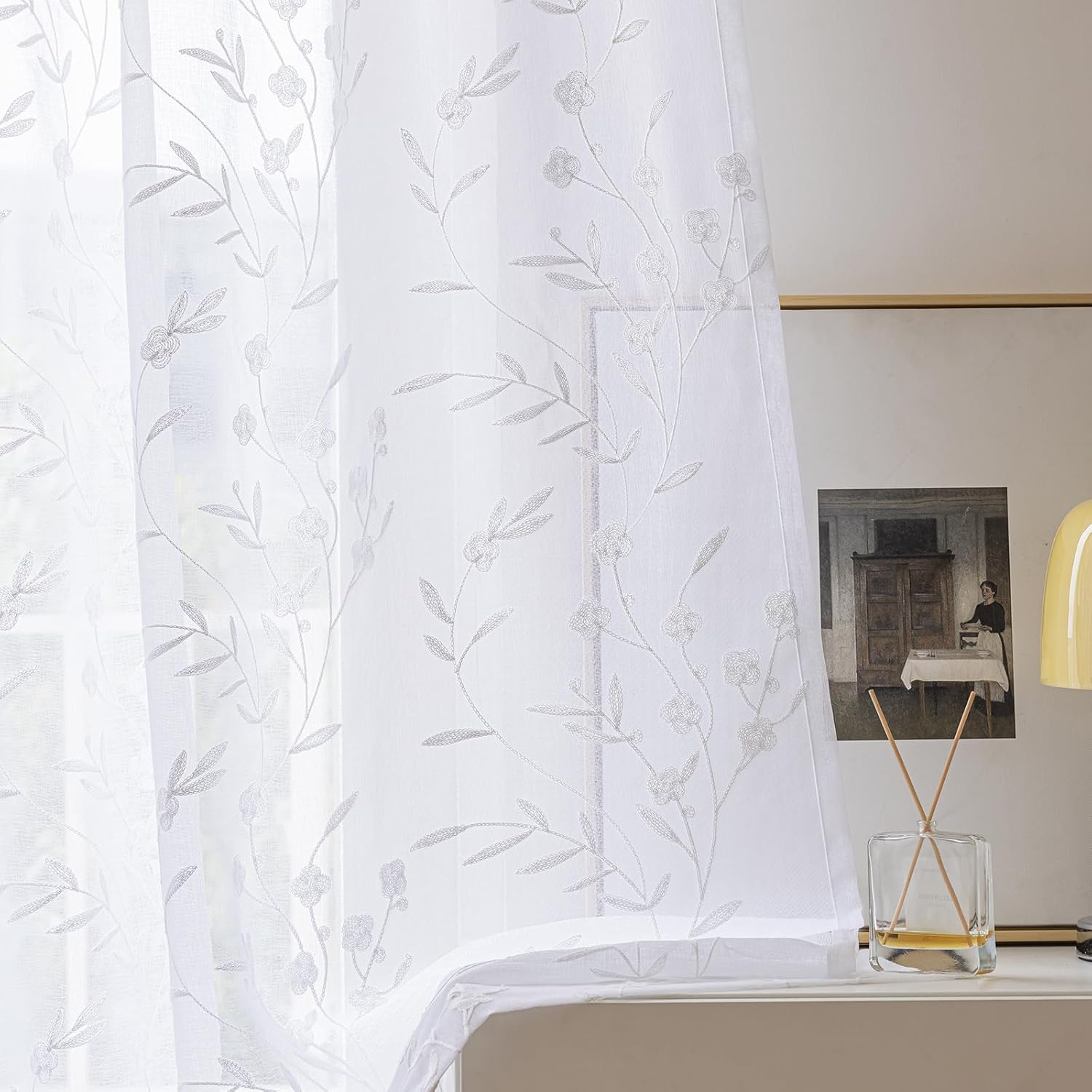 White Sheer Curtains Embroidery 72 Inch Length Rod Pocket Voile Drapes for Living room, Bedroom, Outdoor, Nursery Curtain Semi Flower Curtain Panels for Baby, Womaen, Garden, Lawn, Set of 2, 52"x 72".