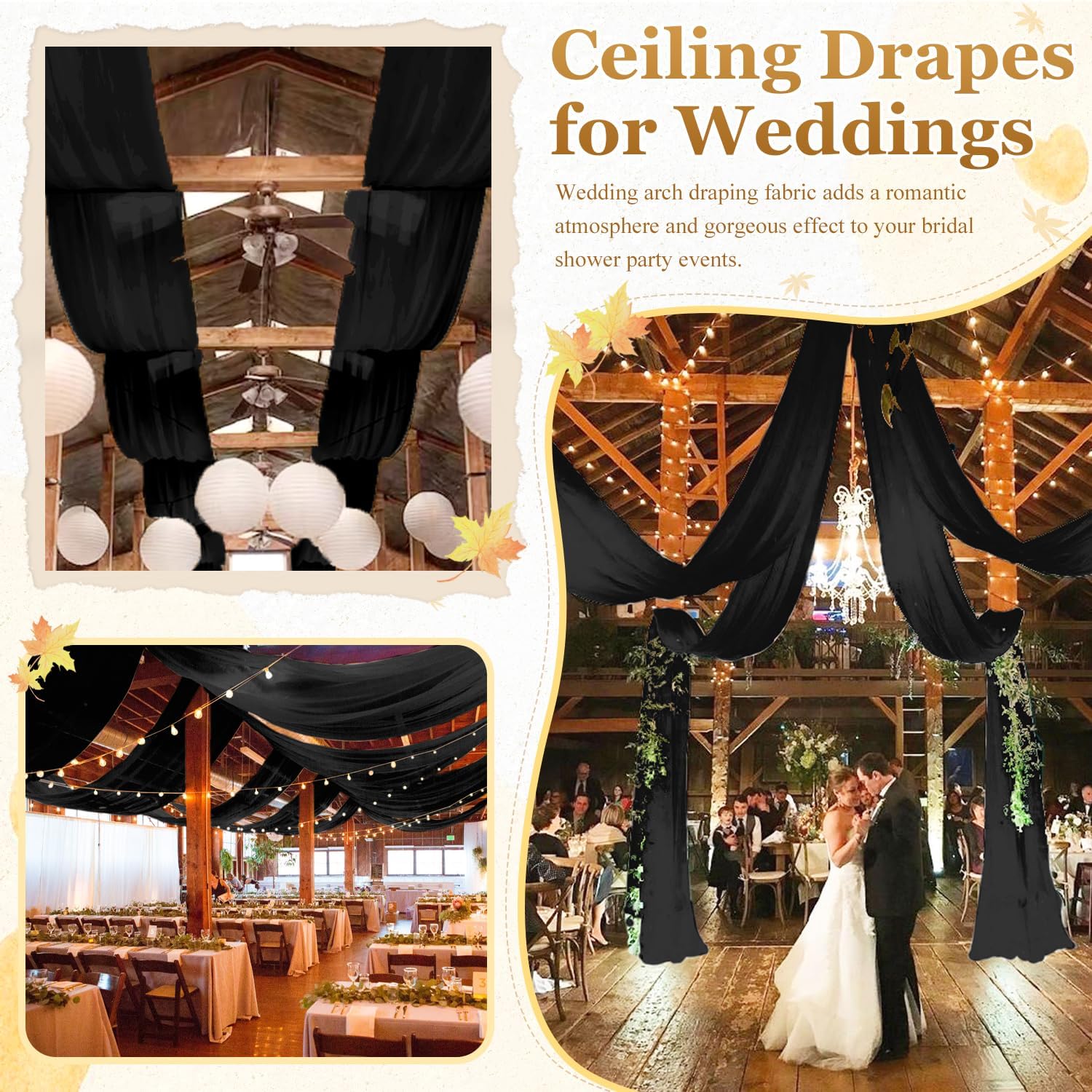 - âSize & Color - Ceiling Drapes: Our black ceiling drapery contains 4 panels. Each panel is 5FT width x30FT length. Wedding arch drapes is long enough creating a great eye catching detail in wedding party events decor.