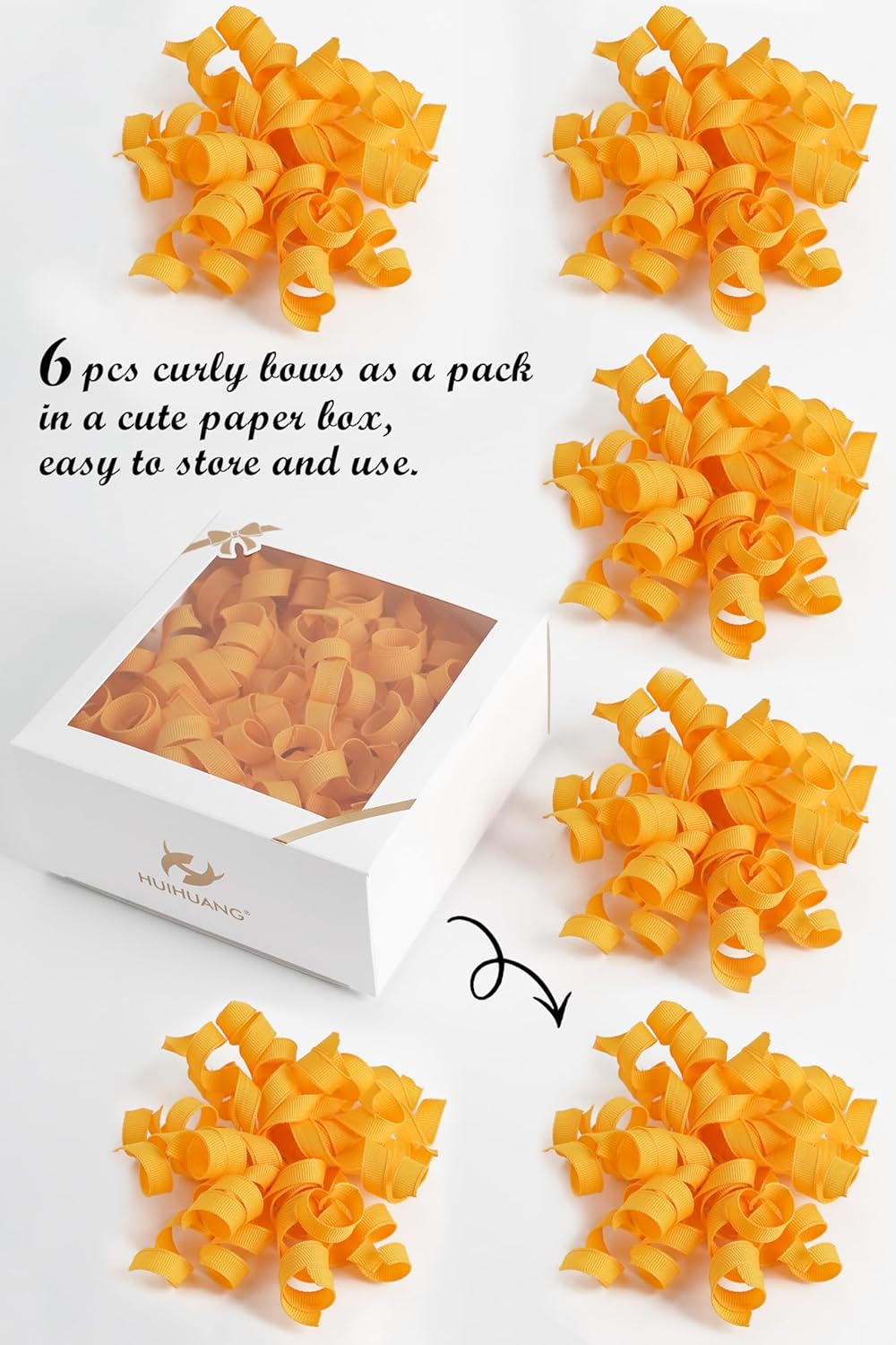 - SIZE & PACK: Each package contains 6 pcs yellow crimped curly bows are made of 12 strands of 3/8"(9mm) wide grosgrain ribbon that measure about 4.5~5" x 4.5~5"