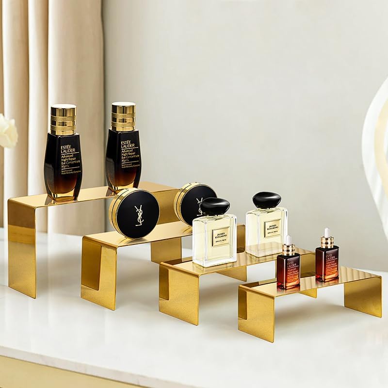 4 Pcs Gold Stainless Steel Display Risers, Display Stand for Cupcake Dessert Perfume Purse Handbag Shoe Jewelry and Funko Pop