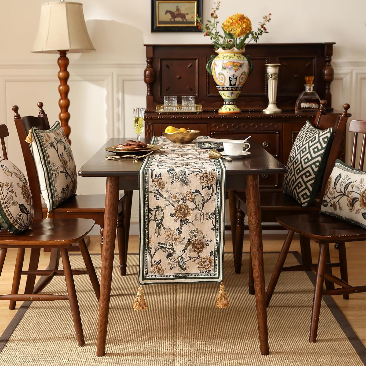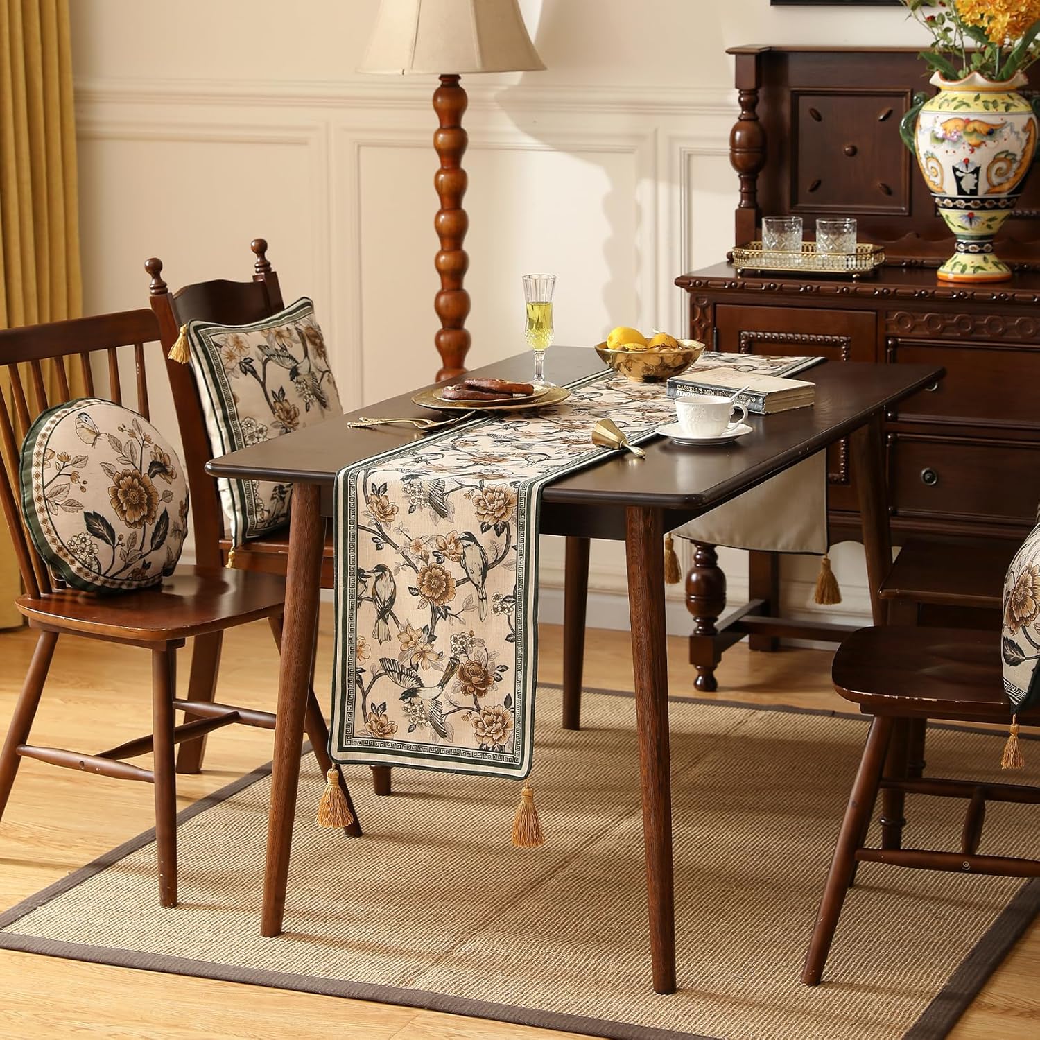 ISAENNE Designer Vintage Beige Linen Table Runner 87 Inches Long,Elegant Floral and Bird Pattern Decor Table Runners for Dining Tables,Thanksgiving,Christmas,Banquet,Party,12"*87"-Murad A