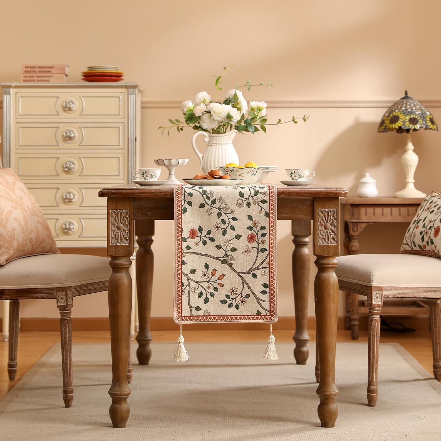 ISAENNE Designer Elegant Linen Floral Table Runner 71 Inches Long,Farmhouse Light Beige Durable Decor Table Runners for Dining Tables,Thanksgiving,Kitchen Tables,Christmas,12"*71"-Flora A