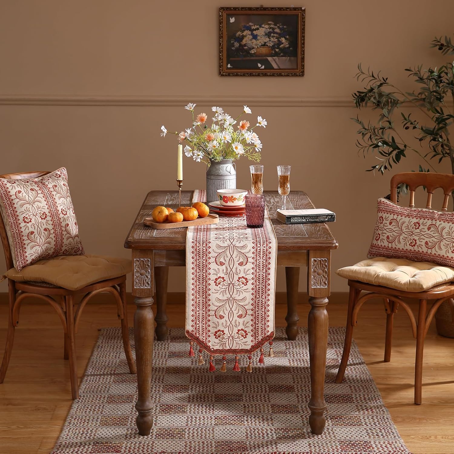 ISAENNE Designer Vintage Linen Table Runner 87 Inches Long,Red Floral Pattern Modern Decor Table Runners for Dining Tables,Thanksgiving,Kitchen Tables,Christmas,Banquet,12"*87"-Chamonix A