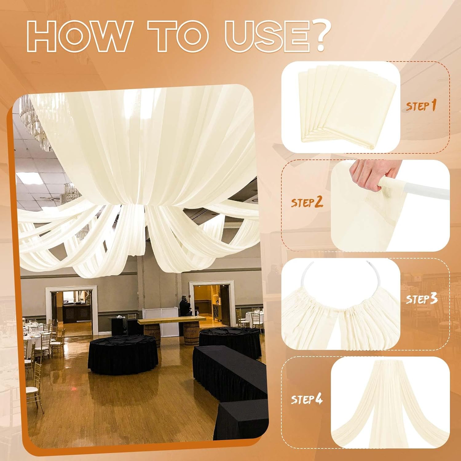 - đăPackage IncludesăYou can get 6 panels Ivory wedding Ceiling Drapes (without hanging pieces). Each wedding extra long curtain measure for 5 feet width X 30 feet length. Enough quantity to meet your needs for decorating weddings, parties and decorating your wedding with romantic Ceiling Drapes will definitely bring you unexpected surprises.