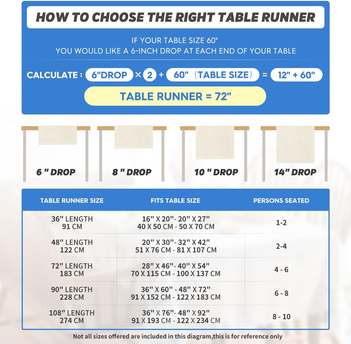 - Fits Table Size : This table runner is 13 x 60 inch, appropriate for a table that can seat 2-4 people, better match your table and give you a delightful dining experience