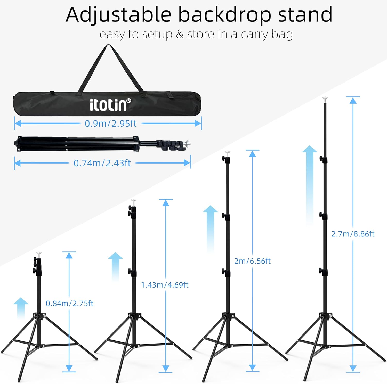 - 【Adjustable Height Stand】 The photo backdrop stand is made of aluminum alloy, height adjustable from 2.6 feet to 9 feet.