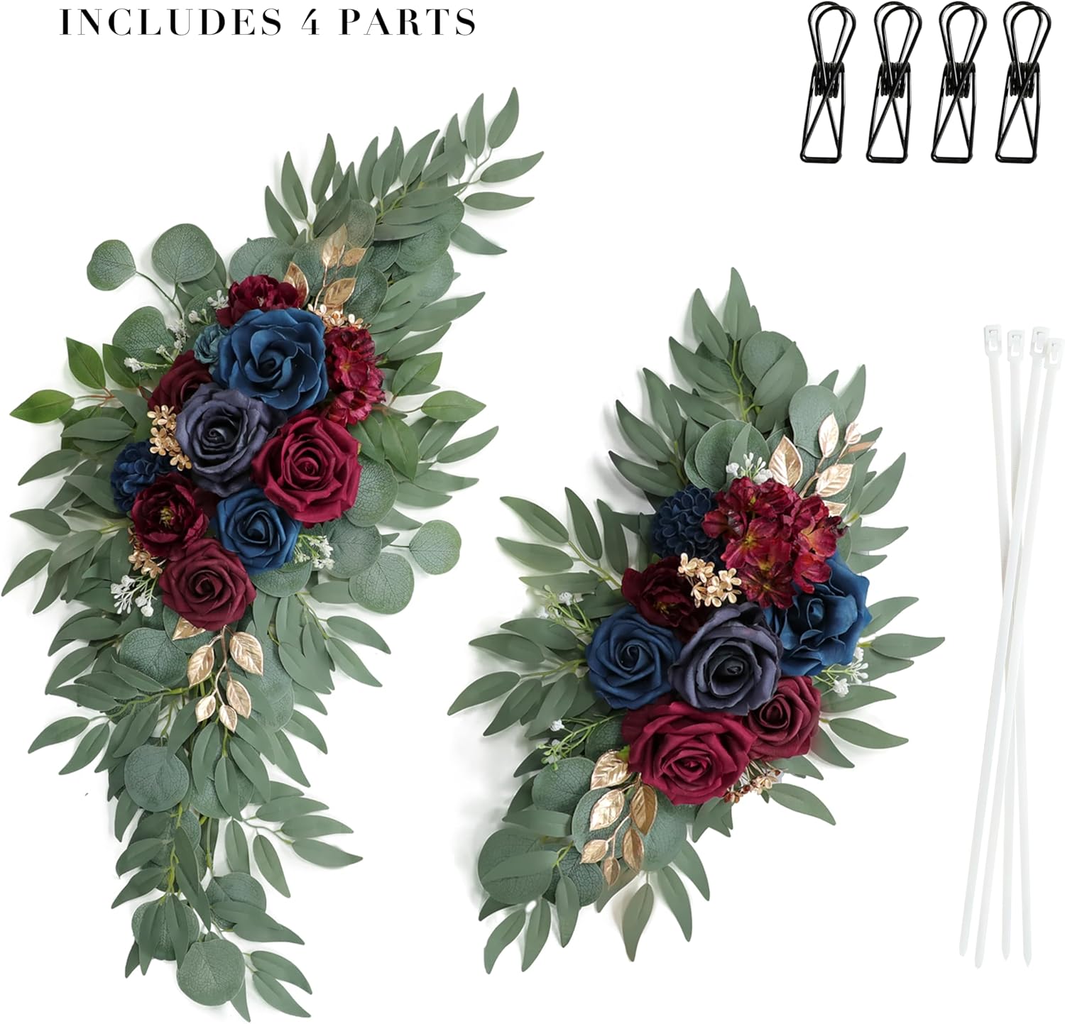 - 2. Package Included: Burgundy & Gold & Navy Blue Wedding Flowers Ornament x 2 + Cable Tie x 4 + Metal Clip x 4 (Does not include wooden sign and bracket). Suitable for round, hexagonal, triangular arches, etc. You can also easily hang them on your fireplace, front door, window, or living room wall after the party.