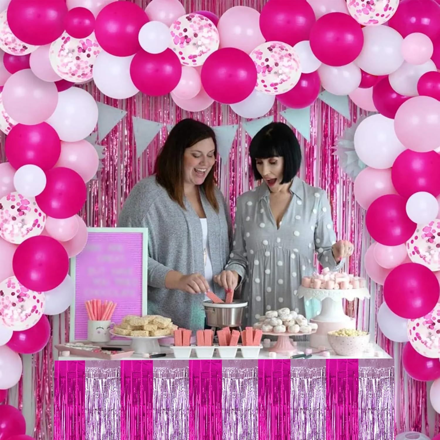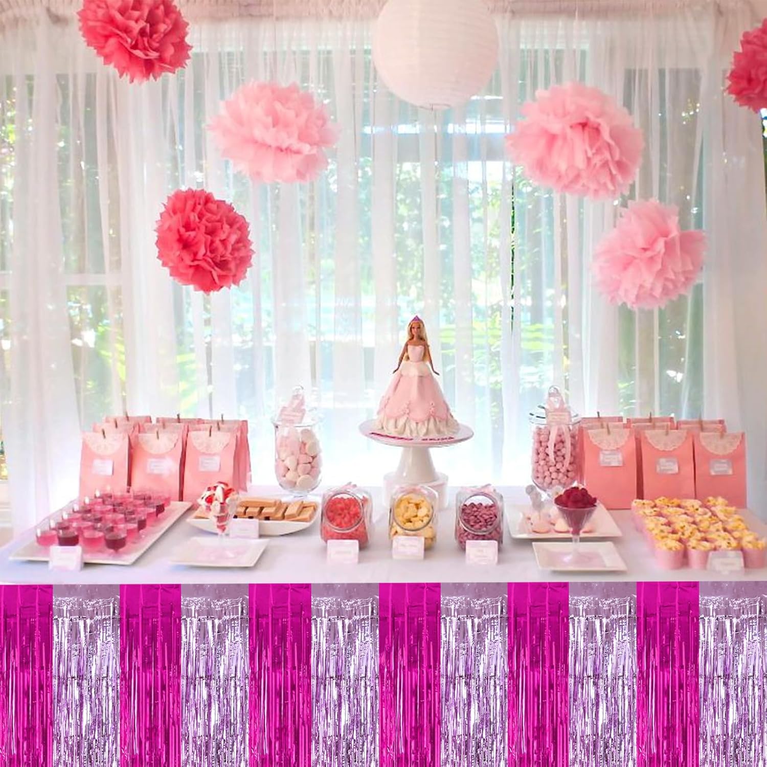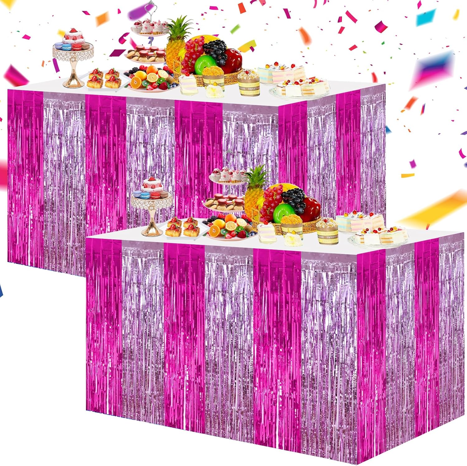 BEISHIDA 2 Pack Hot Pink Pink Table Skirts Party Decorations Purple Metallic Tinsel Foil Fringe Rectangle Round Table Skirts for Girls Birthday Holiday Valentines Party Supplies