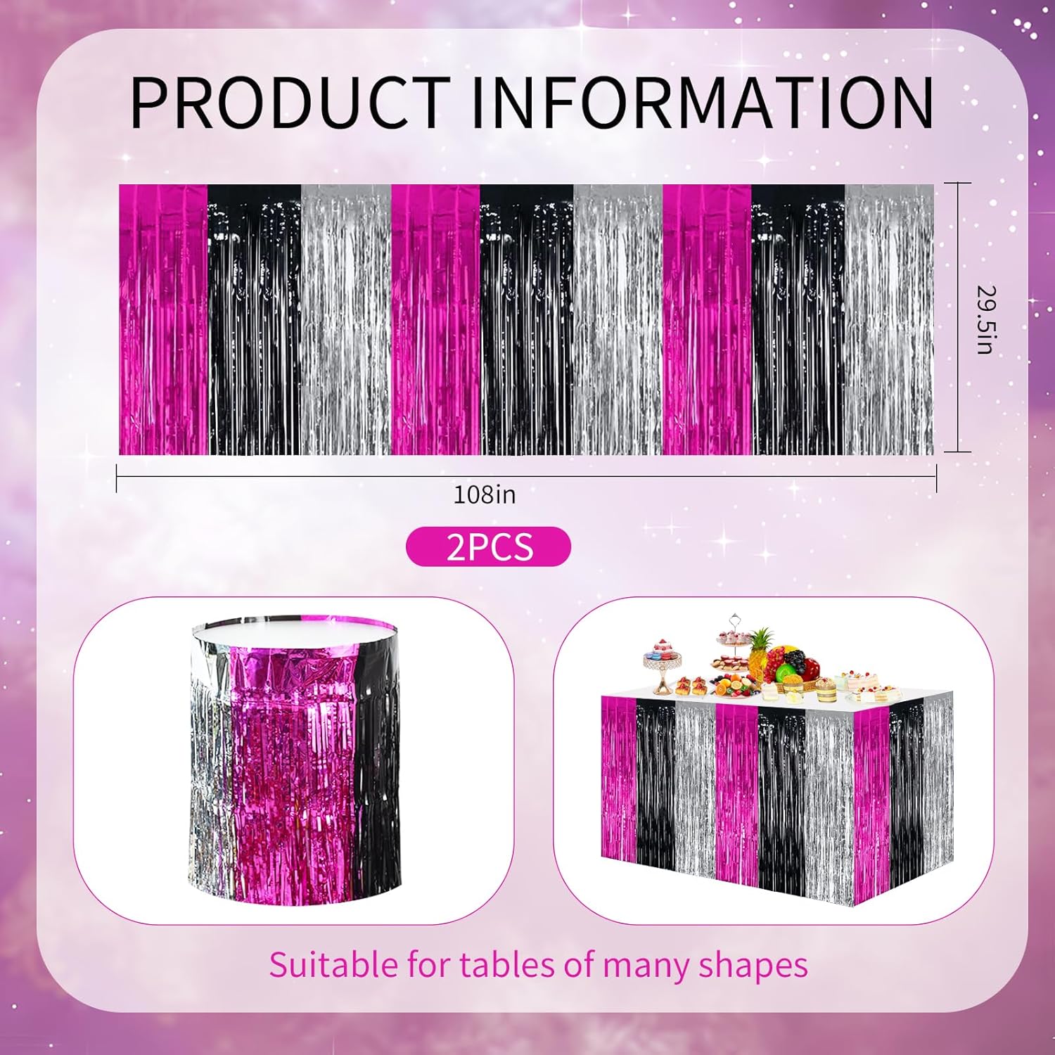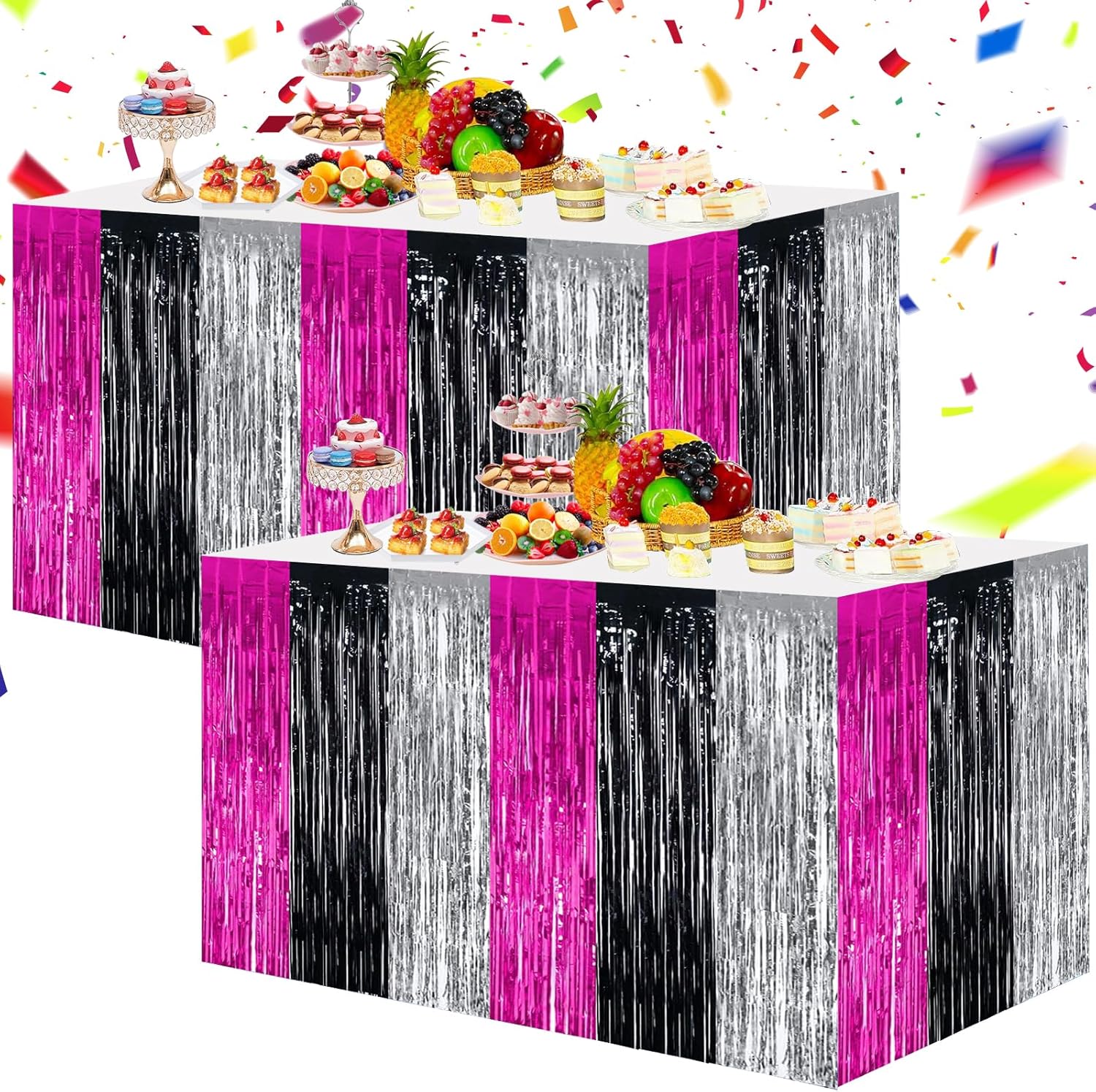 BEISHIDA 2 Pack Hot Pink Black Silver Table Skirts Party Decorations Metallic Tinsel Foil Fringe Table Skirts for Hot Girls Mouse Theme Birthday Holiday Party