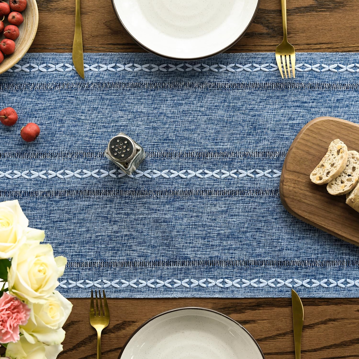Artoid Mode Blue Rustic Cotton Linen Table Runner, Seasonal Embroidered Hollow Kitchen Dining Table Decoration for Home Party Decor 13x72 Inch