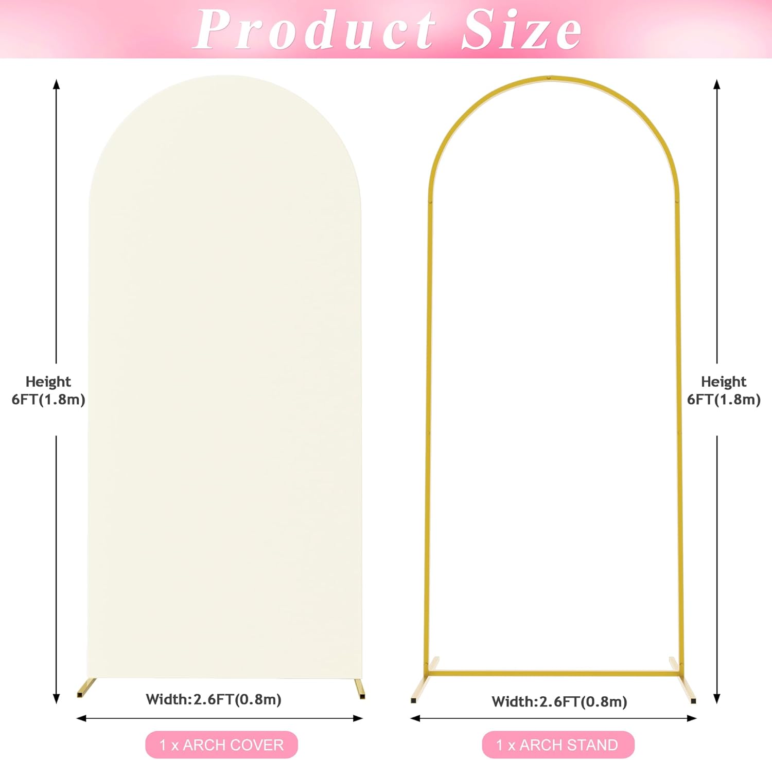 - 【Arch Stand and Covers Package】Package contains 1pcs wedding arch stand and 1pcs arch cover. Size: 6x2.6ft(HxW). Material: metal arch backdrop stand and spandex arch cover. Color: Ivory arch cover and gold wedding arch stand. Decorate your party with our gold arch stand and arch covers to create an epic decor for your celebration.