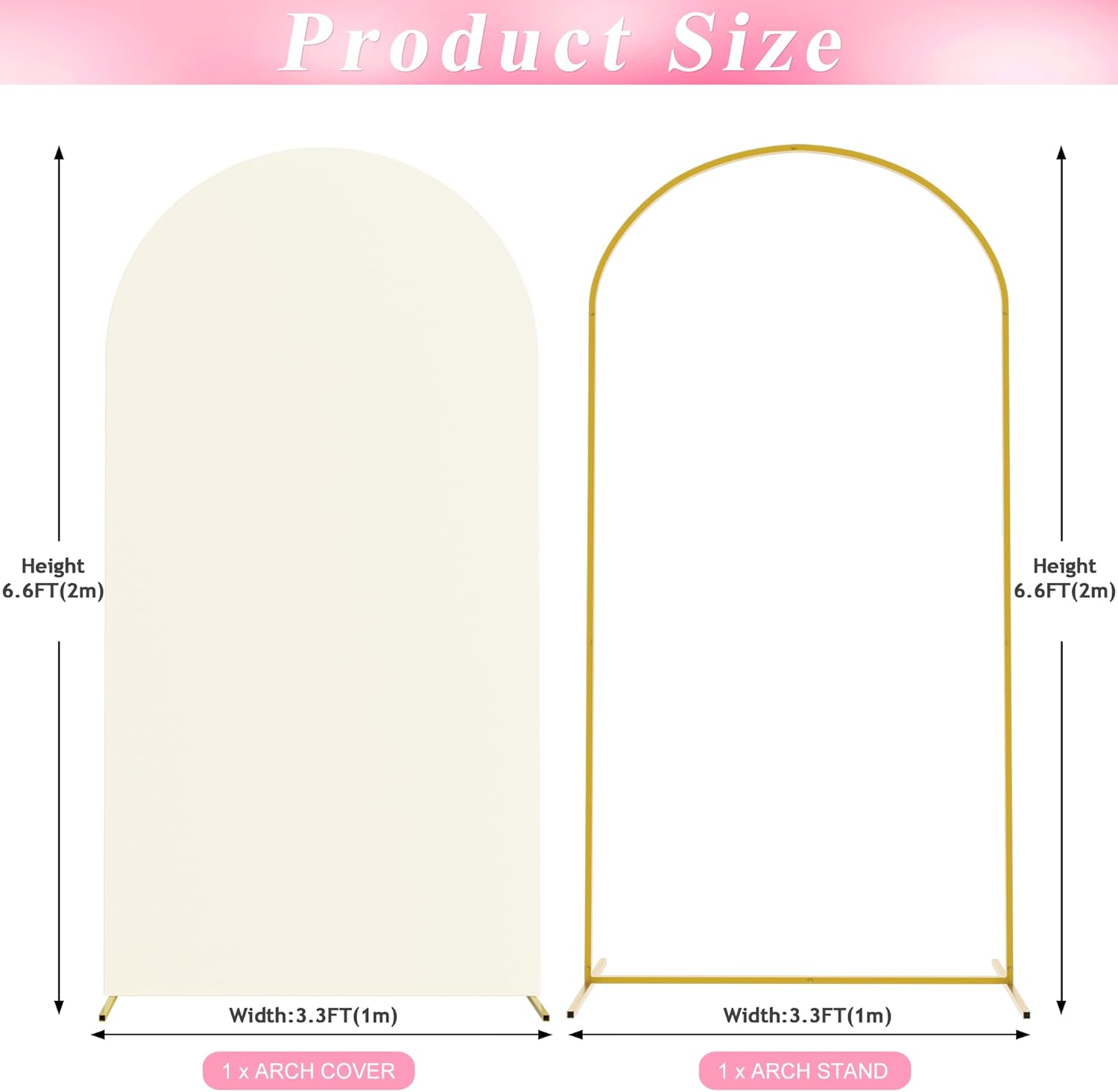 - 【Arch Stand and Covers Package】Package contains 1pcs wedding arch stand and 1pcs arch cover. Size: 6.6x3.3ft(HxW). Material: metal arch backdrop stand and spandex arch cover. Color: Ivory arch cover and gold wedding arch stand. Decorate your party with our gold arch stand and arch covers to create an epic decor for your celebration.