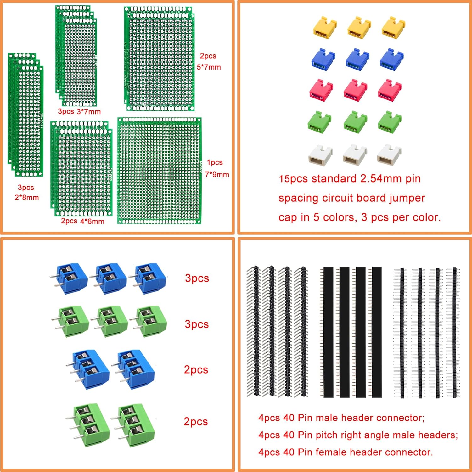 - Screw Terminal Block and Jumper caps:6pcs 5.08-301-2P screw terminal block and 4pcs 5.08-301-3P screw terminal block; 15 pcs standard 2.54mm pin spacing circuit board jumper caps in 5 colors, 3 pcs per color.