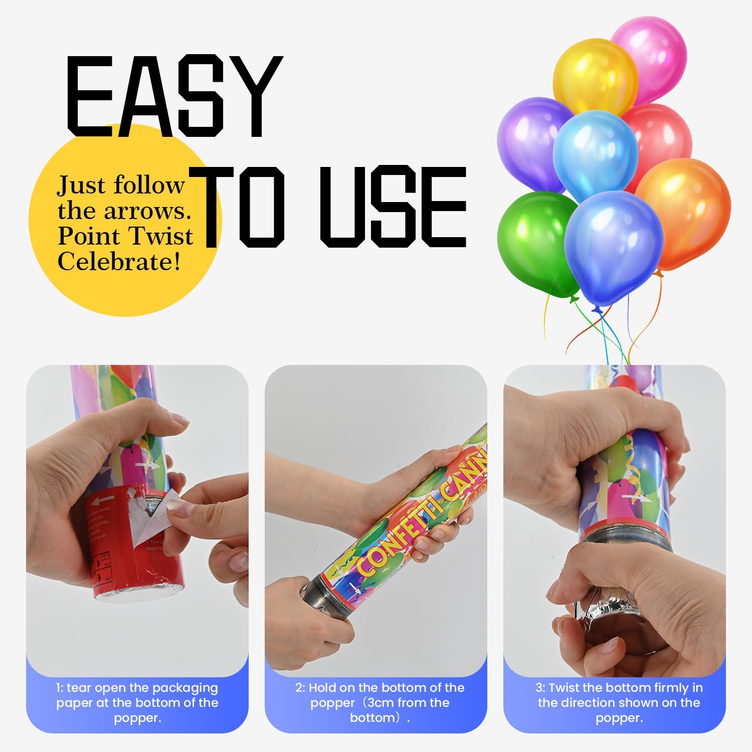 - Confetti Cannon 12 Pack - Don't worry about struggling to pop the confetti cannon, simply tear open the packaging paper at the bottom of the party popper and twist to release a burst of multicolor confetti flying up to 10-15 feet in the air. It's that simple, and party cannon will add an extra touch of magic to your celebration!