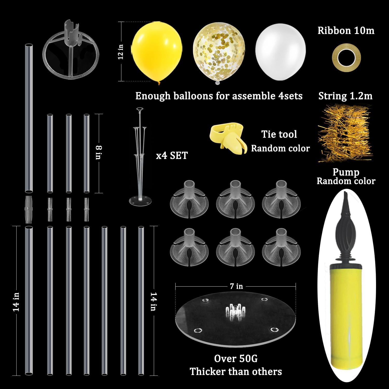 - WHAT INLCUDE: This balloon stand kit include 4 set balloon holders, 35pcs balloons - yellow white balloons and gold confetti balloons, balloon pump, ribbons, glue dots and tie tool