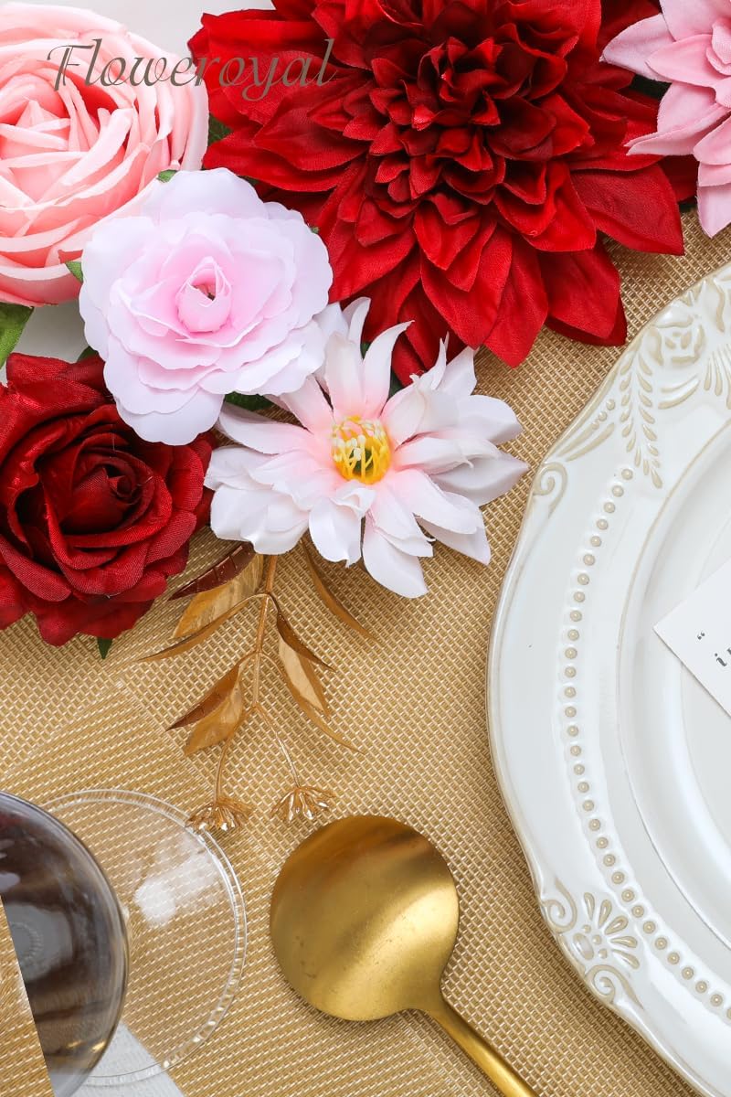 Floweroyal Artificial Flowers Combo Red Flowers Mix Silk Flowers Dahlia Roses with Stems for DIY Wedding Bridal Bouquets, Baby Shower, Floral Arrangement, Table Centerpieces, Home Decorations.