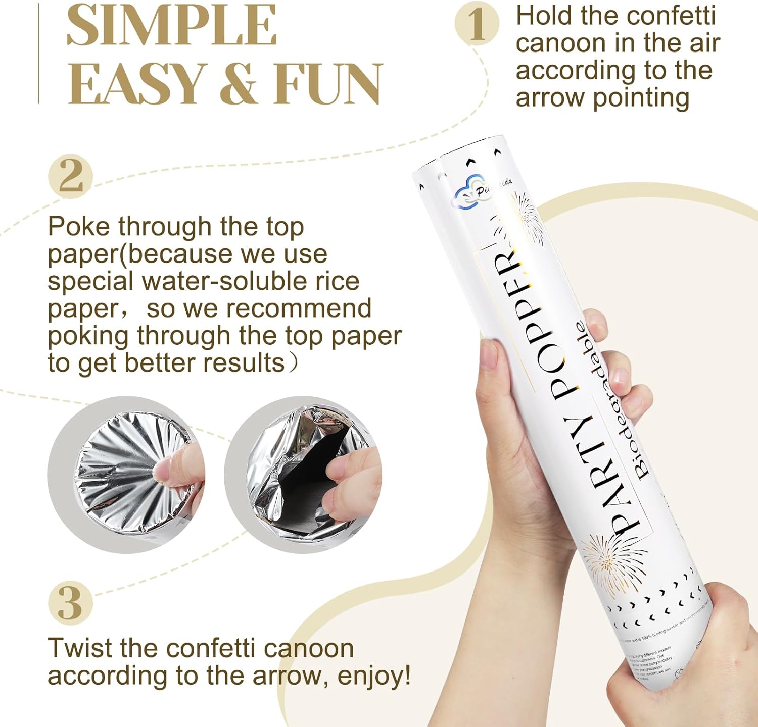 - Biodegradable Lettering: With "biodegradable" lettering printed on each white confetti cannon, every guest who sees and uses these beautiful white confetti poppers will know you've chosen the right way to party