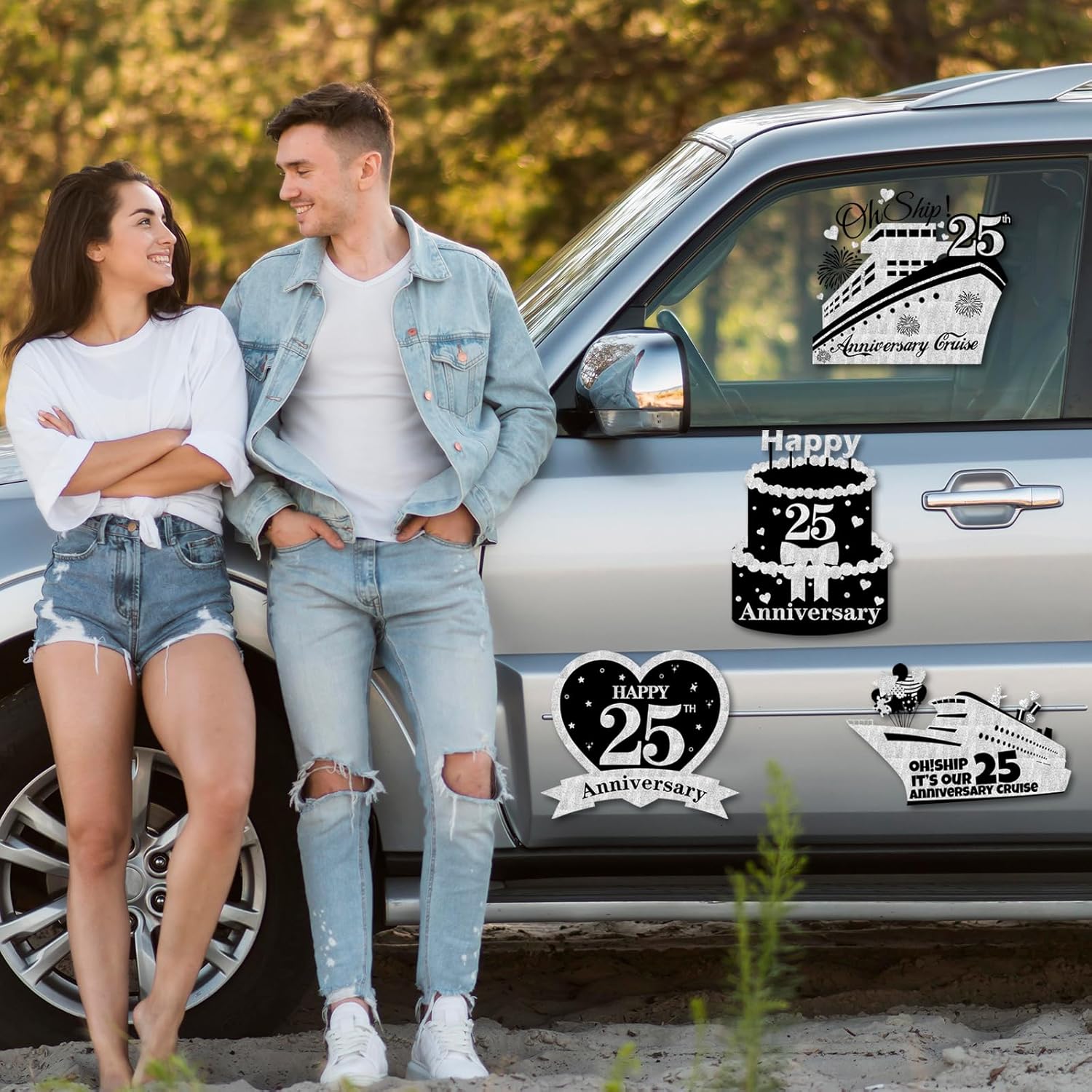 4 PCS Large 25th Anniversary Cruise Door Magnets Decorations Happy 25th Anniversary Cruise Ship Door Decor Magnetic Wedding Magnets Garage Refrigerator Car Magnets for Cabin Stateroom (Black Silver)