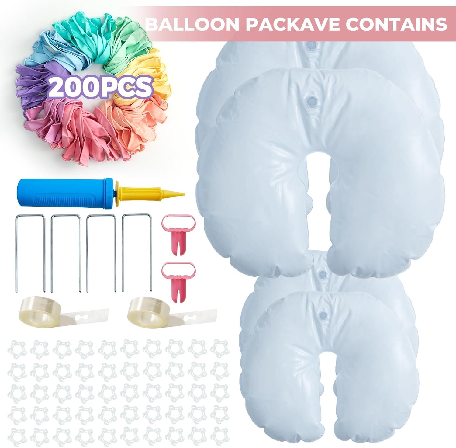- PACKAGE--This balloon arch backdrop stand kit includes 2 PCS backdrop stands and 200 PCS balloons. (2 big water bags, 2 small water bags, 4 ground stakes, 2 rolls of hole tape, 50 flower-shaped clips, 1 hand-held pump, and 2 knotters).A sufficient number of balloons can create a perfect balloon party decoration background, arch stand size: 7.2FT x 4FT(H x W) and 6FT x 2.6FT(H x W).