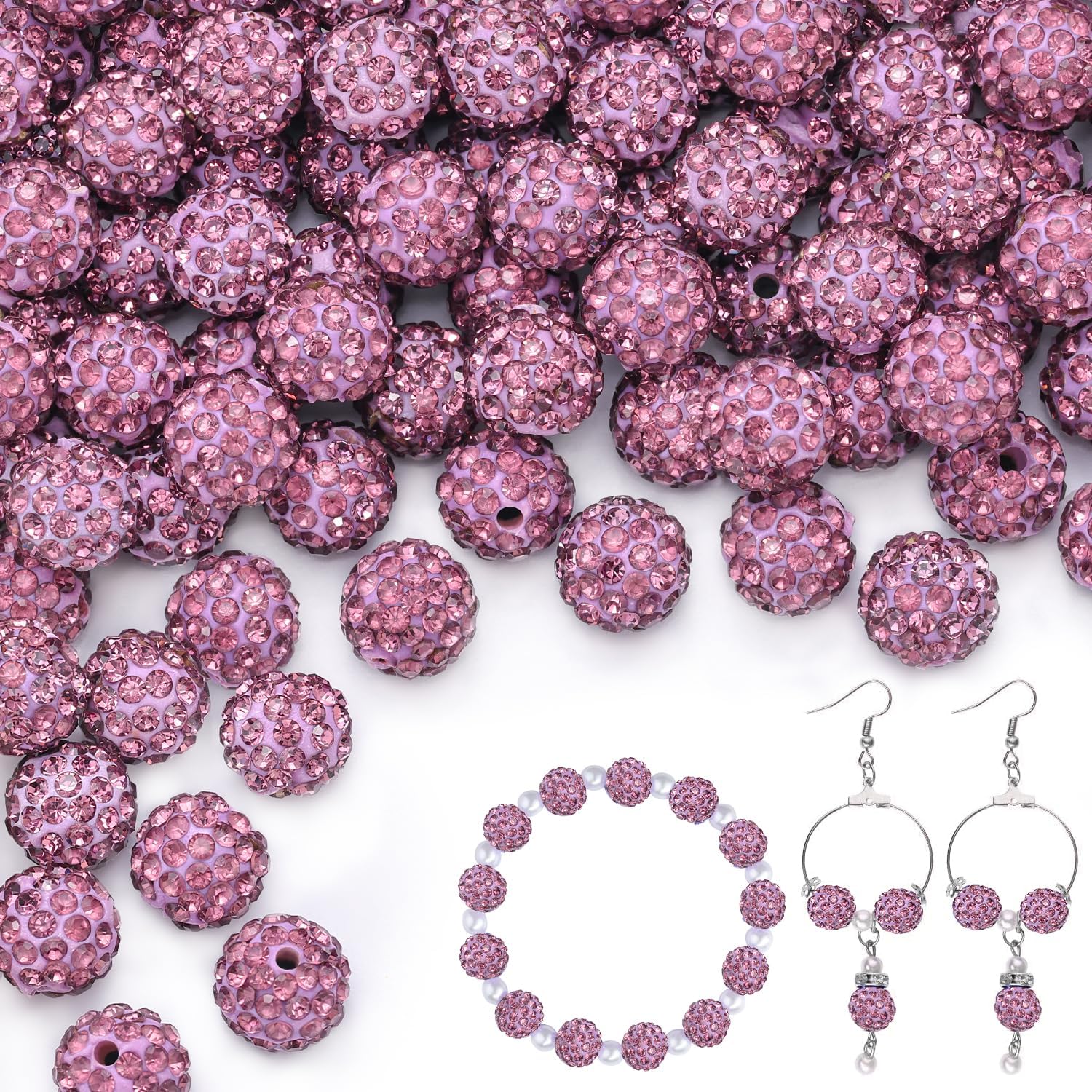 100pcs 10mm Rhinestone Beads for Jewelry Making, Light Purple Shiny Round Shamballa Disco Beads Bulk, Sparkle Crystal Clay Christmas for Bracelet Baseball Necklace Earring Crafting and DIY