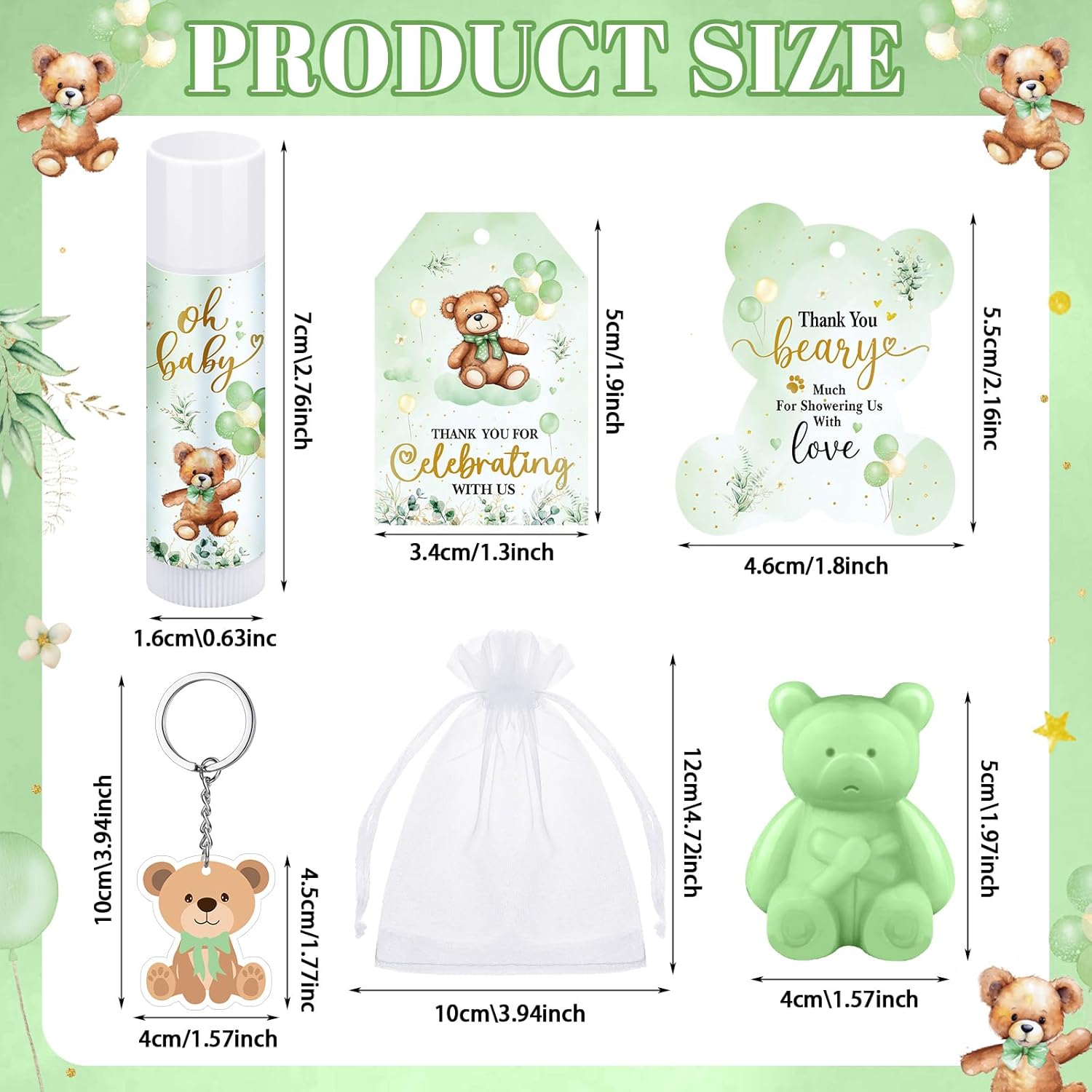 - Complete Baby Shower Favor Sets: enjoy a comprehensive baby shower favors set that are suitable for a baby shower; Each package includes 48 lip balms, 48 bear shaped soaps, 48 bear keychains, 48 organza bags, 48 thank you tags, and 48 bear shaped cards; These can be individually packaged in organza bags alongside a thank you tag, offering a sophisticated and heartfelt gesture to appreciate your guests