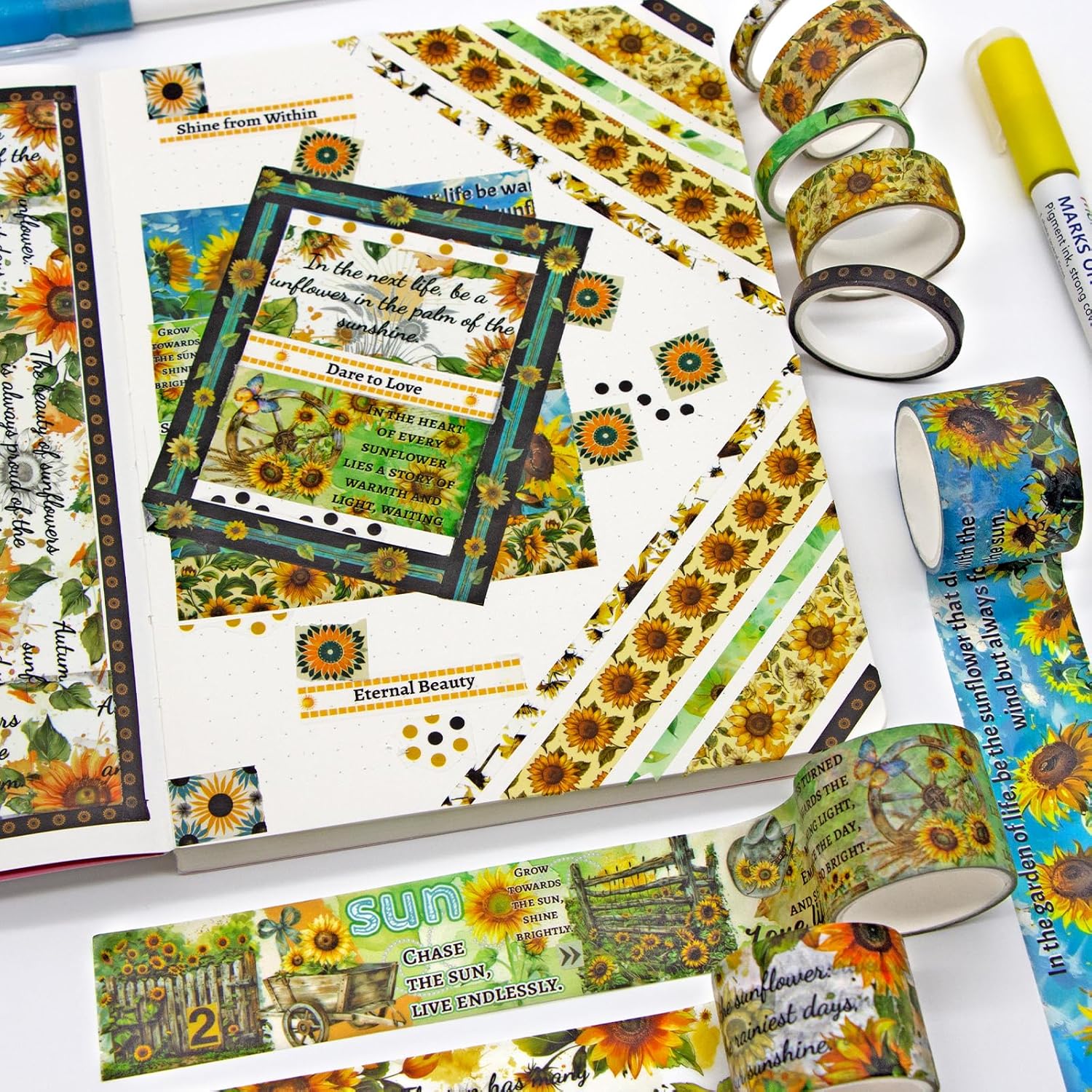 - [High Quality] - The sunflower themed washi scrapbooking tape supplies are made of high quality materials. These decorative tapes can be repositioned and torn. The artists tape can be easily peeled off without leaving any sticky residue and is clearly printed to show clean, bright colors. These unique qualities make washi tape a great set of artwork