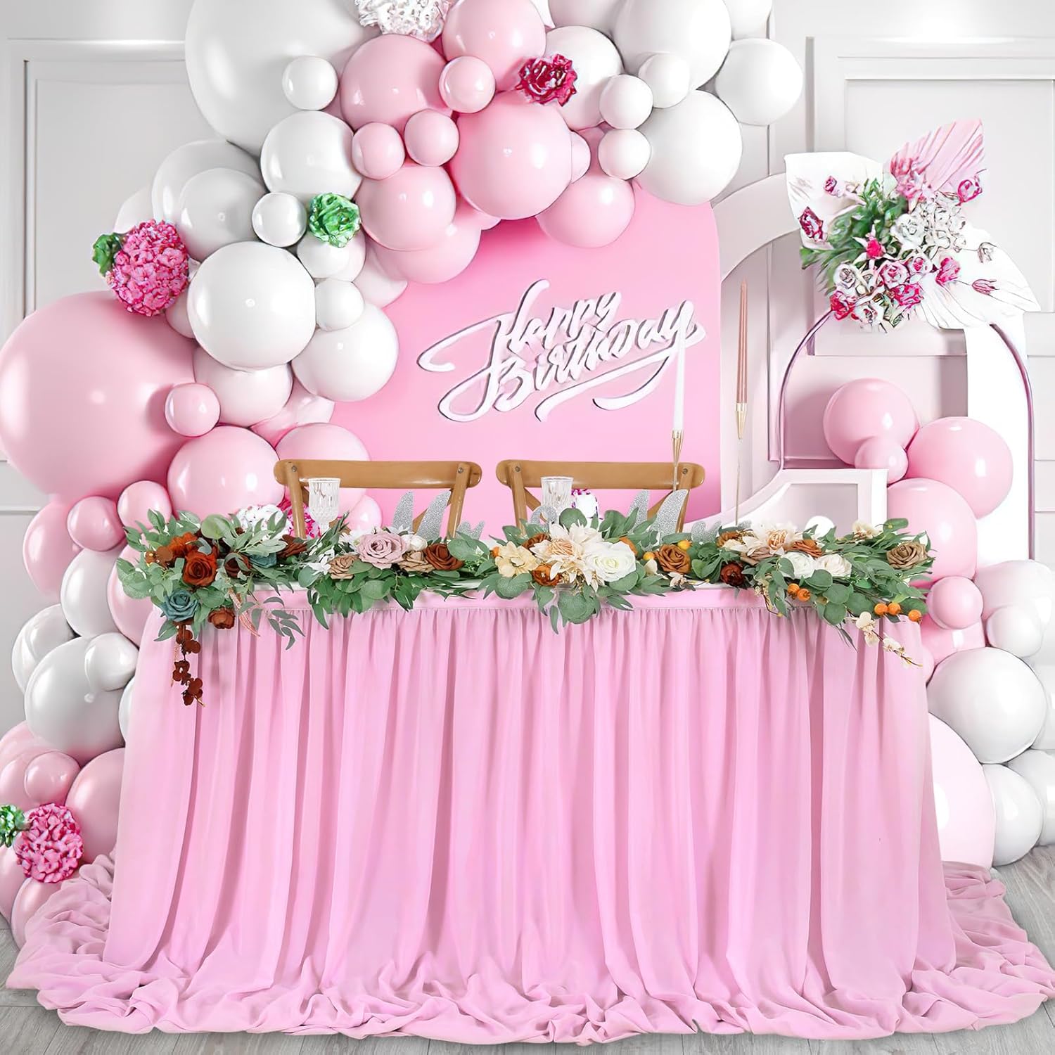 - 💡 Pink Table Skirt Material: The extra long chiffon table skirt is made of Sheer Chiffon which is wrinkle-free, soft, and with a nice drapery. Table skirt both robust for kids birthday party supplies and elegant if used for wedding decoration.
