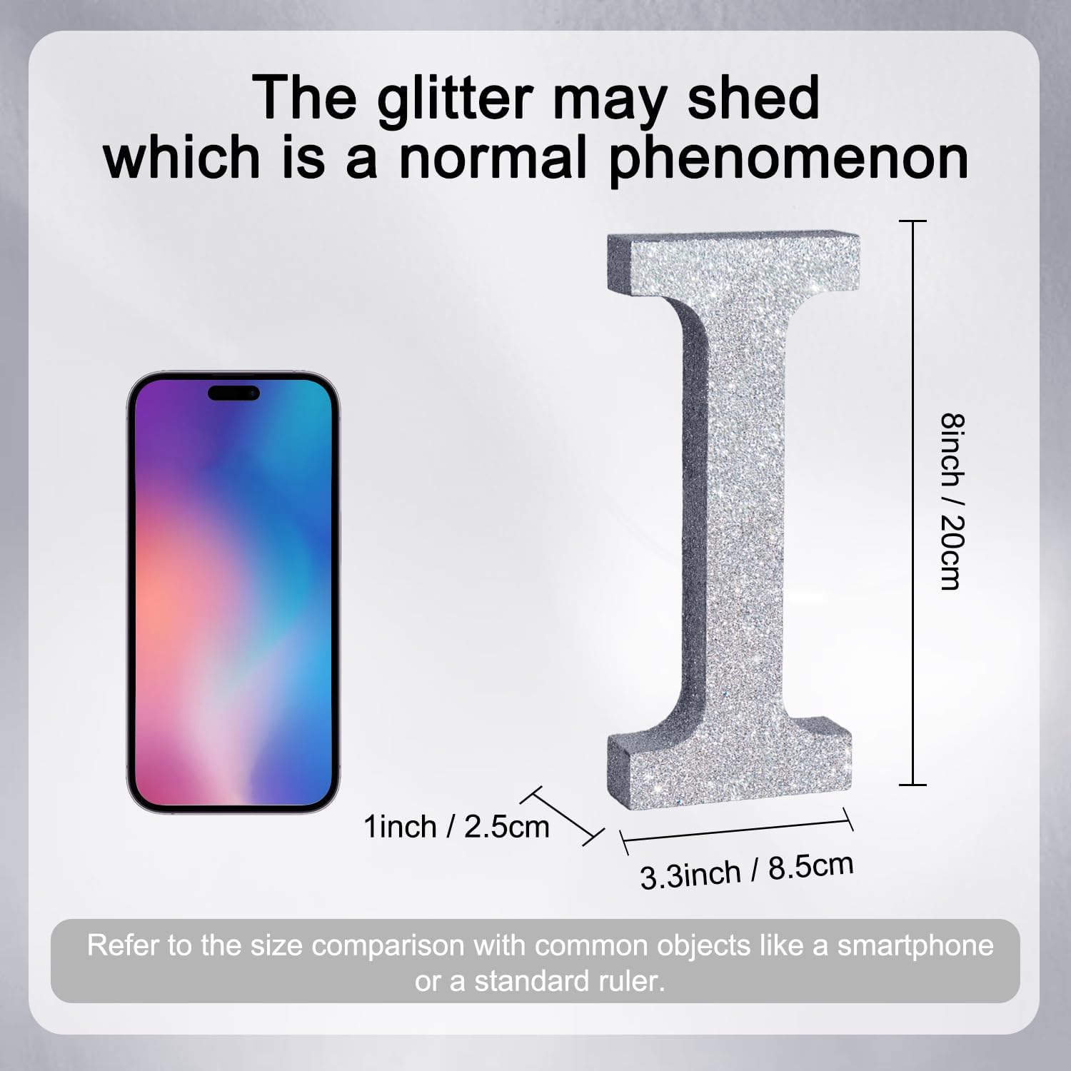 - ITEM INFORMATION AND SIZE: 1 Pcs * I Silver Glitter Letter Ornament. Size: 8 * 5.8 * 1 Inches (20*15*2.5 CM). Before purchasing, Please check the size carefully to make sure it meets your needs