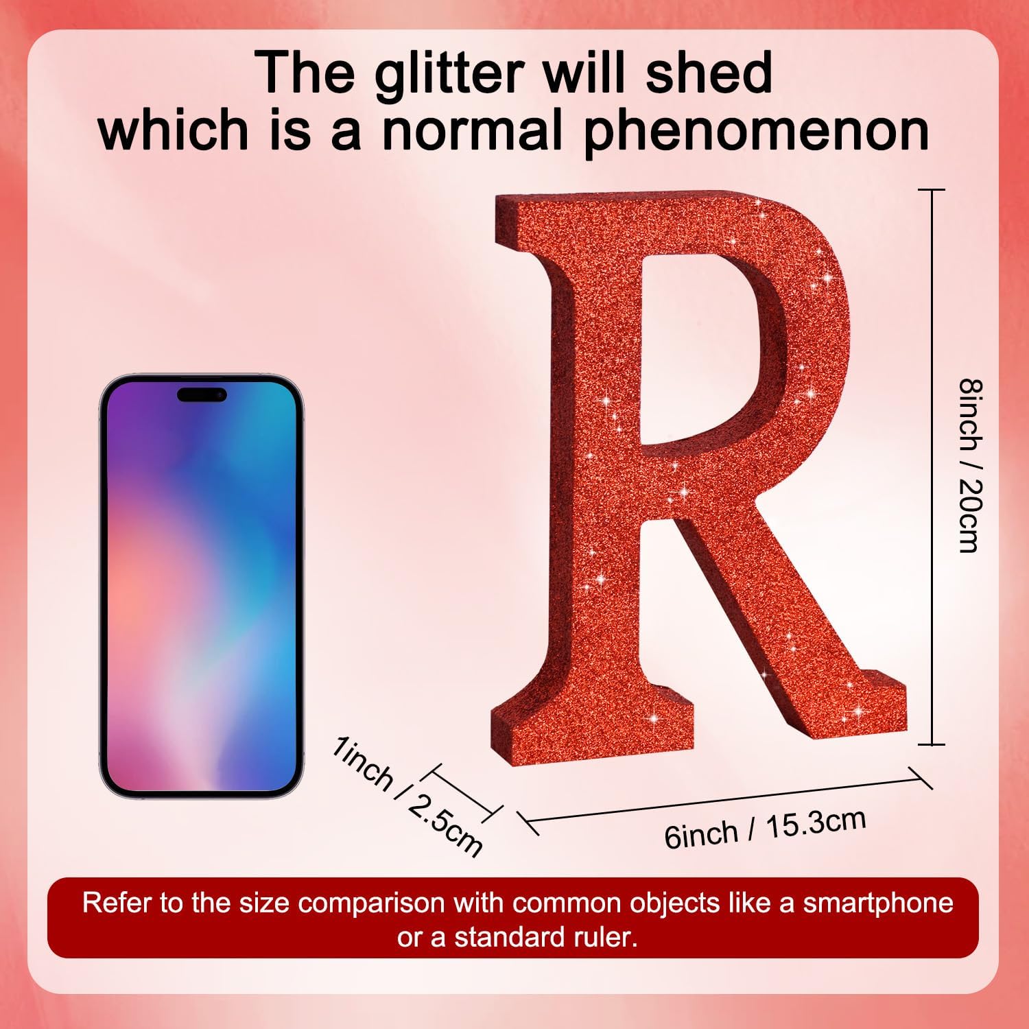 - ITEM INFORMATION AND SIZE: 1 Pcs * R Red Glitter Letter Ornament. Size: 8 * 5.8 * 1 Inches (20*15*2.5 CM). Before purchasing, Please check the size carefully to make sure it meets your needs