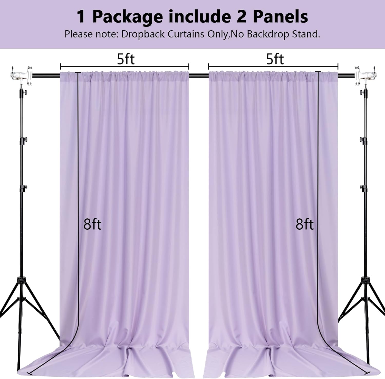 - DIMENSIONS: Each order is for 2 (two) polyester curtains. Each curtain measures 5 feet wide x 8 feet high. Entire backdrop measures 10 feet wide x 8 feet high.Each curtain panel comes with 4 inch rod pocket on top, fit up to any standard rods. (Please note: Dropback Curtains Only,No Backdrop Stand.)