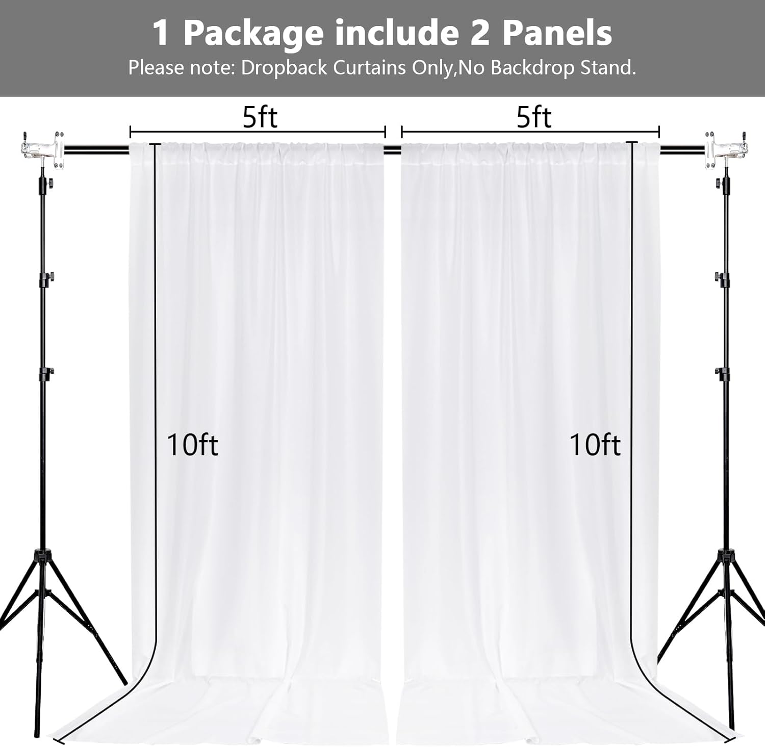 - DIMENSIONS: Each order is for 2 (two) polyester curtains. Each curtain measures 5 feet wide x 10 feet high. Entire backdrop measures 10 feet wide x 10 feet high.Each curtain panel comes with 4 inch rod pocket on top, fit up to any standard rods. (Please note: Dropback Curtains Only,No Backdrop Stand.)