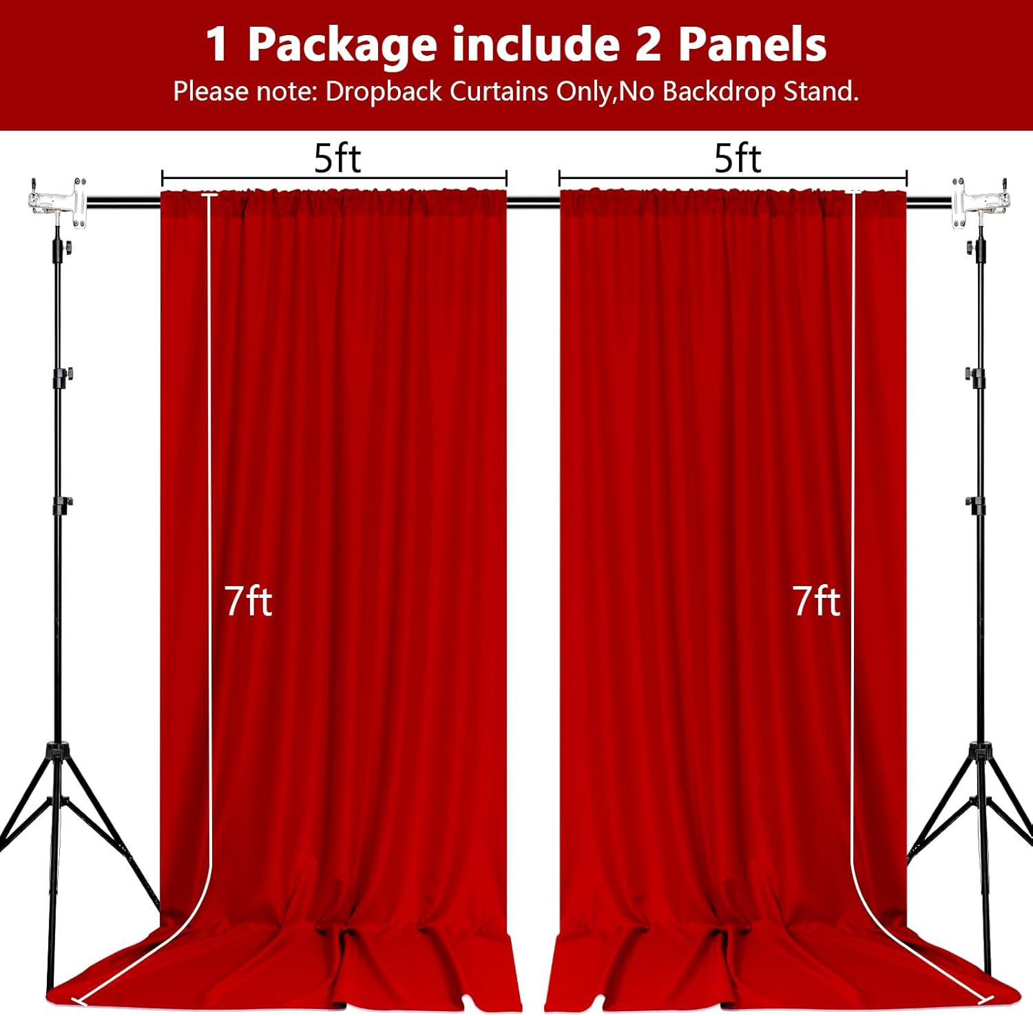 - DIMENSIONS: Each order is for 2 (two) polyester curtains. Each curtain measures 5 feet wide x 7 feet high. Entire backdrop measures 10 feet wide x 7 feet high.Each curtain panel comes with 4 inch rod pocket on top, fit up to any standard rods. (Please note: Dropback Curtains Only,No Backdrop Stand.)