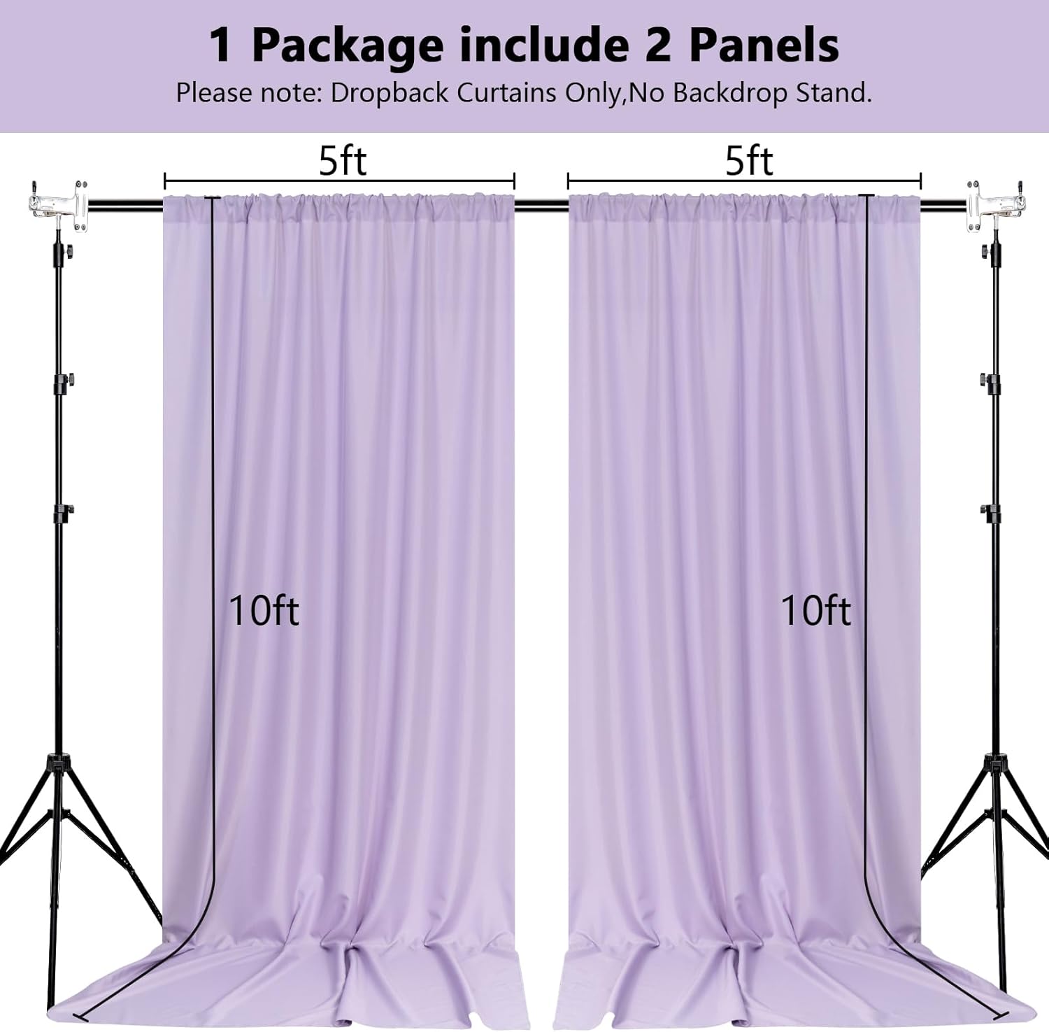 - DIMENSIONS: Each order is for 2 (two) polyester curtains. Each curtain measures 5 feet wide x 10 feet high. Entire backdrop measures 10 feet wide x 10 feet high.Each curtain panel comes with 4 inch rod pocket on top, fit up to any standard rods. (Please note: Dropback Curtains Only,No Backdrop Stand.)