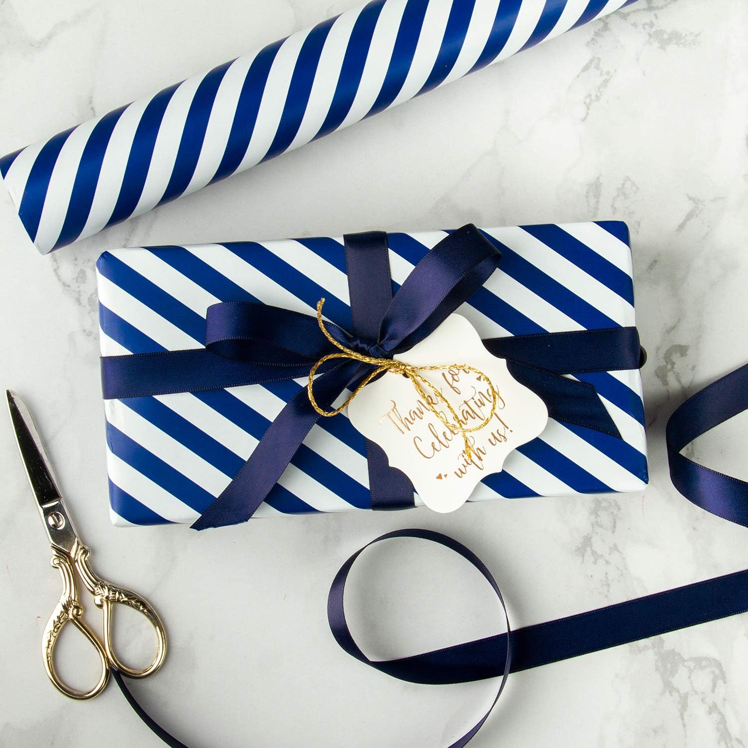 - REVERSIBLE: A solid navy side and a navy/white stripe side. Two different classic designs make beautiful and varied gift presentations easy.