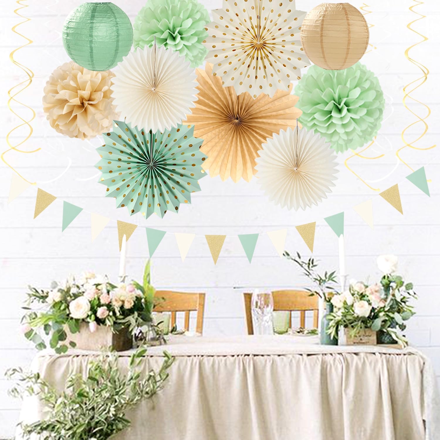 - Package Including:The sage-green beige champagne gold party decorations 1pcs paper garland dots,1pcs Triangle Flags in three color,15pcs tassel garland in three color,2pcs 8” paper lantern,6pcs streamers in two color,2pcs 10” paper lantern fan,2pcs 10” honeycomb ball in two color,1pcs 12” honeycomb ball,2pcs 12”paper lantern fan,1pcs 16”paper lantern fan.
