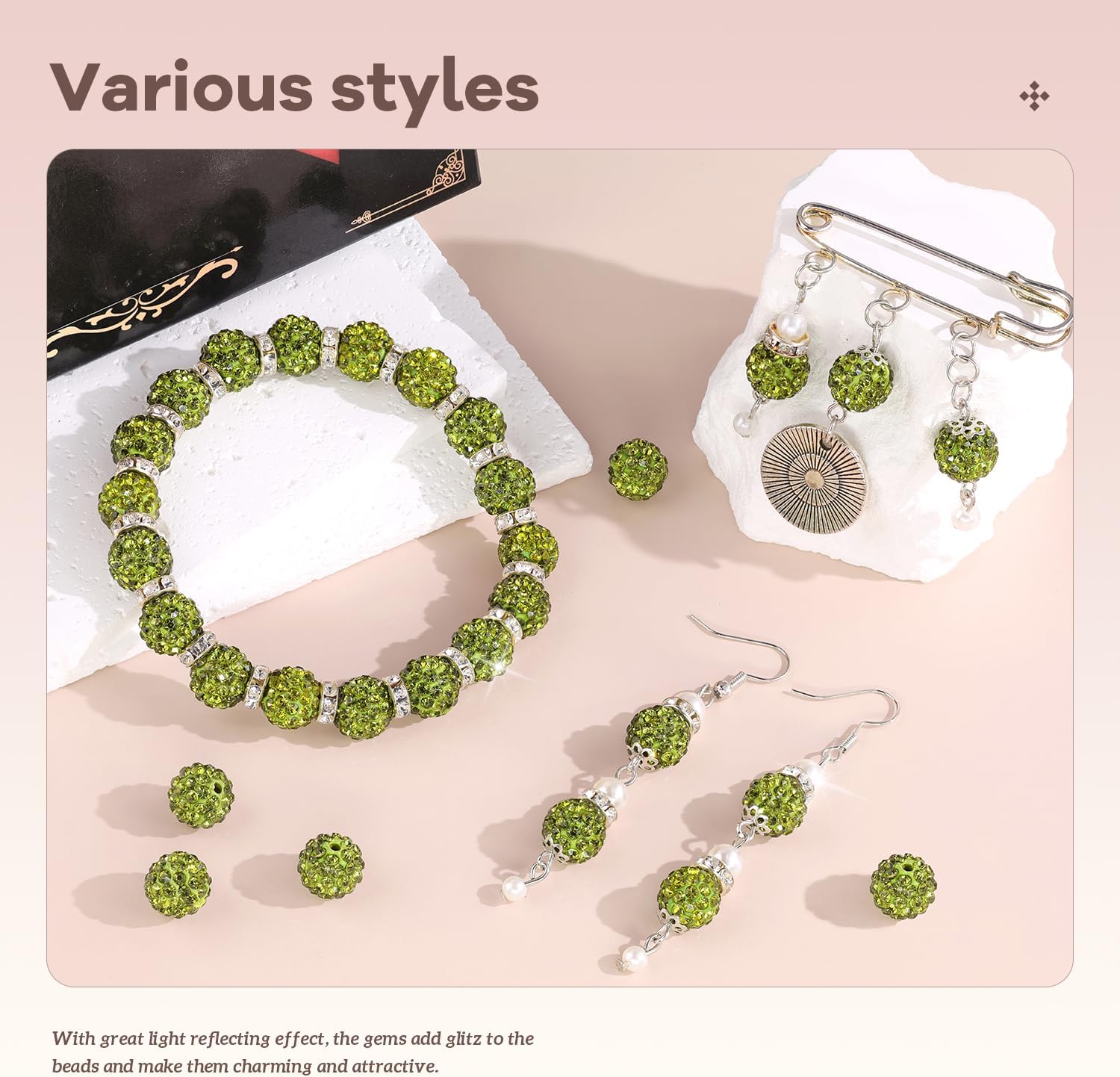 - BLING EFFECT --With great light reflecting effect, the gems add glitz to the beads and make it charming and eye-catching. Our beads are made of polymer clay embedded with glass rhinestones with shining and it's not easy to fall off