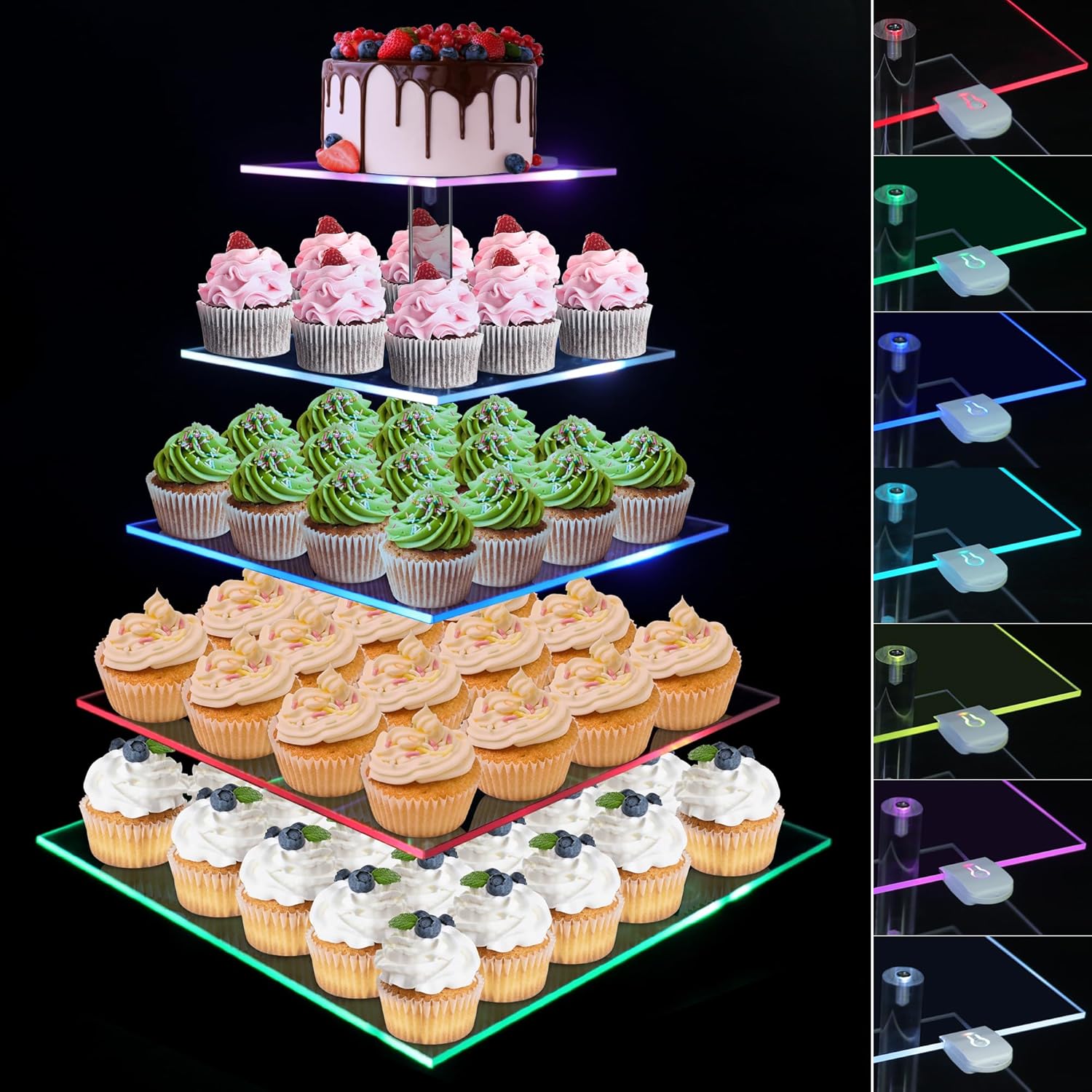 Cupcake Stand with Rechargeable Led, 5 Tier Clear Cupcake Holder, 7 Colors Light Cupcake Tower, Acrylic Dessert Table Display Set for Weddings, Christmas, Birthday, Parties, Baby Showers
