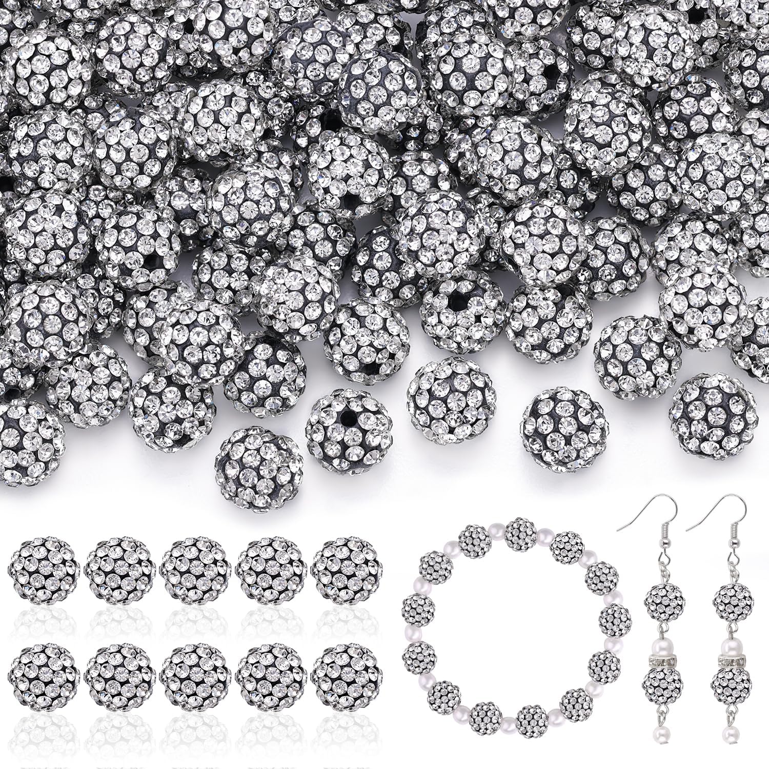200pcs 10mm Rhinestone Beads for Jewelry Making, Black White Shiny Round Disco Ball Beads Bulk, Sparkle Crystal Clay Christmas for Bracelet Baseball Necklace Earring Crafting and DIY