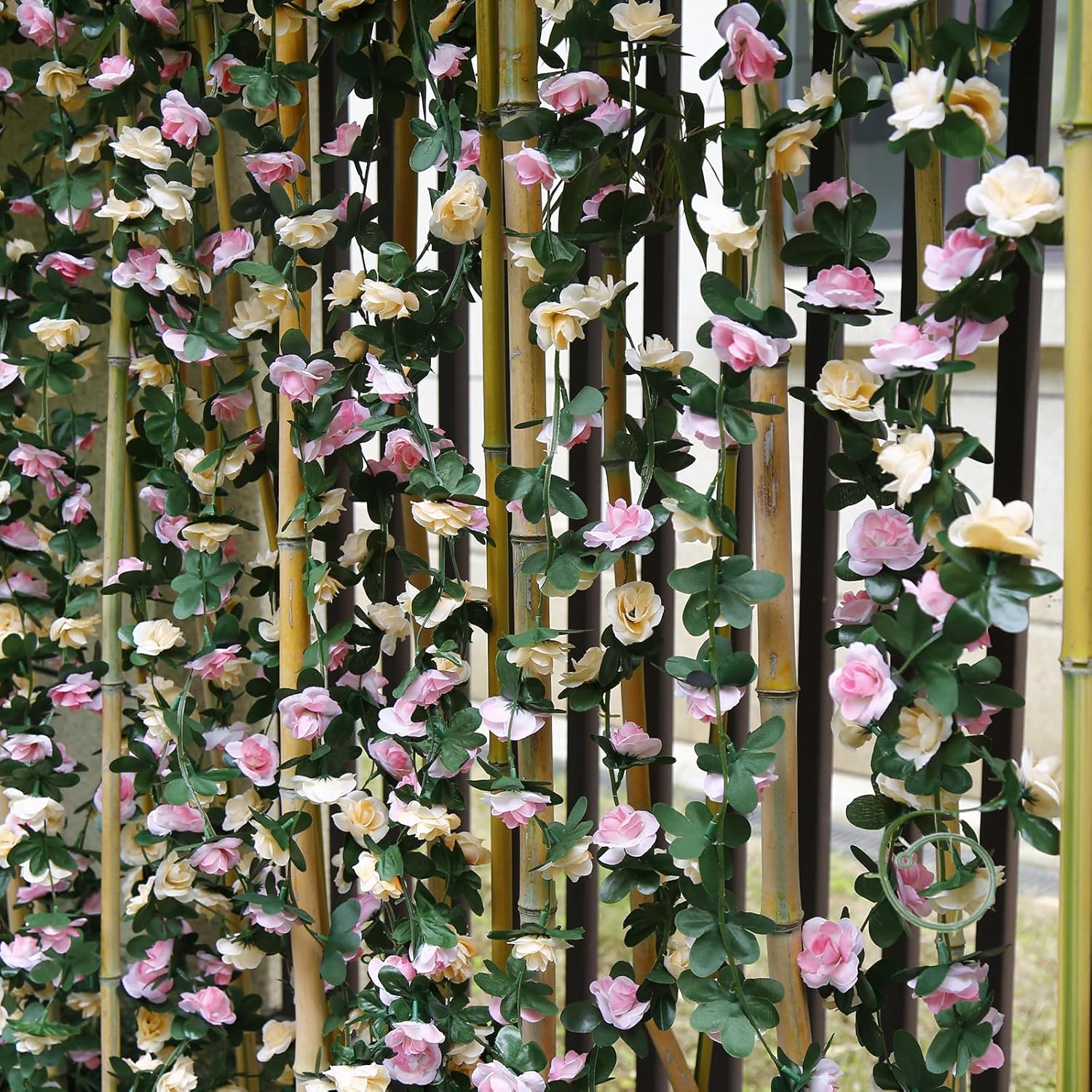 - Material: Rose floral garland is handmade from silk and plastic. The vine is soft and brightly colored, and can be bent, cut, and hung as needed